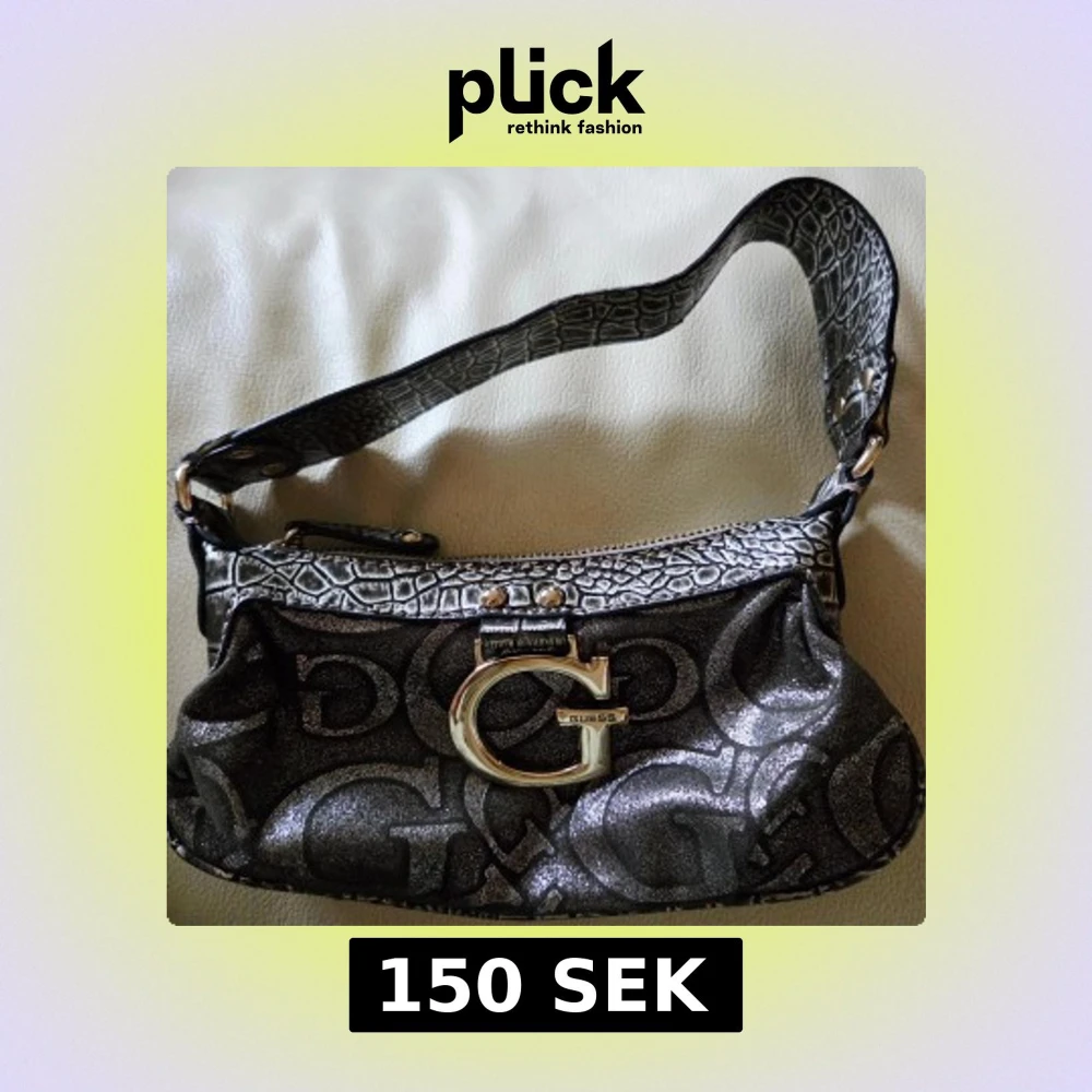 Cool svart axelväska från Guess med glittrigt material och stora G-loggor över hela väskan. Väskan har ett brett axelband med krokodilpräglat mönster och en stor metallfärgad G-detalj framtill. Perfekt för dig som vill sticka ut.