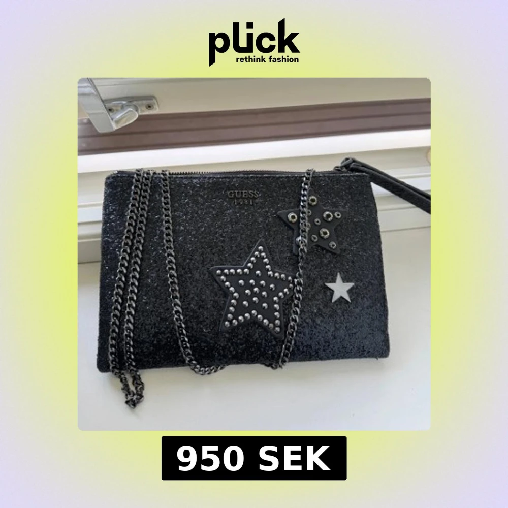 Säljer en svart glittrig axelväska från Guess med kedjerem och dekorativa stjärnor med nitar på framsidan. Väskan har dragkedja upptill och innerfoder med logotypmönster. Perfekt för att lyfta din outfit!