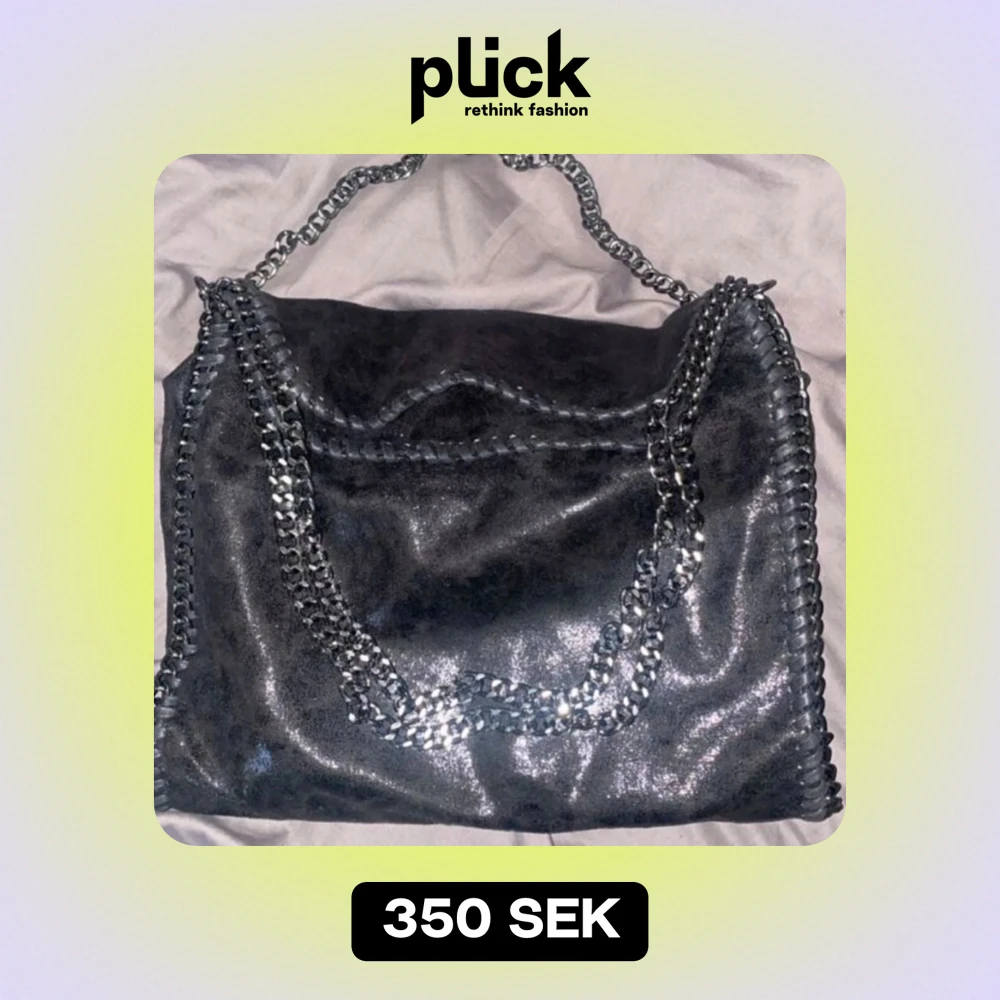Snygg svart axelväska i glittrigt material med coola kedjedetaljer. Perfekt för en utekväll eller fest! Väskan har en unik design med kedjor som handtag och längs kanterna, vilket ger den en edgy look. Den är rymlig och passar till alla dina essentials. Lik den trendiga Stockholmstil väskan 💕köptes för 700