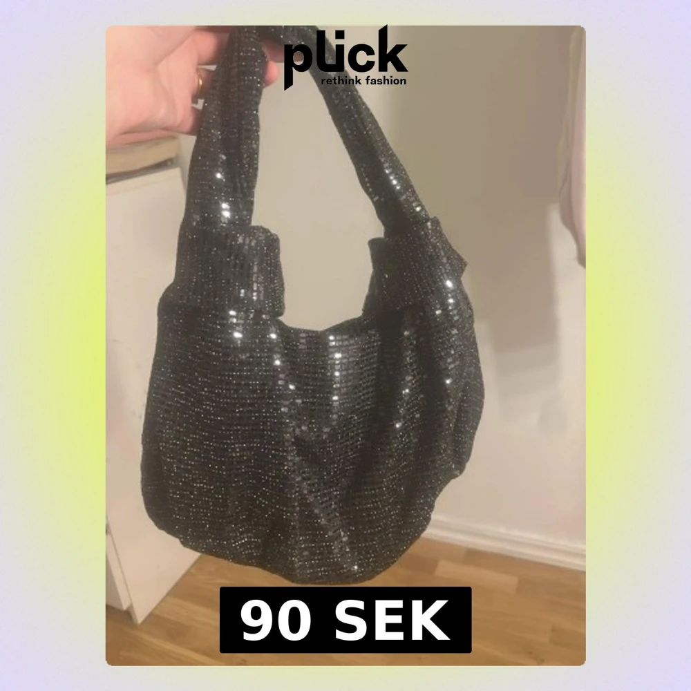 Trendig svart handväska med glittriga paljetter som ger en riktigt snygg och festlig look. Väskan har en mjuk, rundad form och ett bredare handtag som gör den bekväm att bära. Perfekt accessoar för att lyfta din outfit. Köpt från Gina tricot aldrig använt