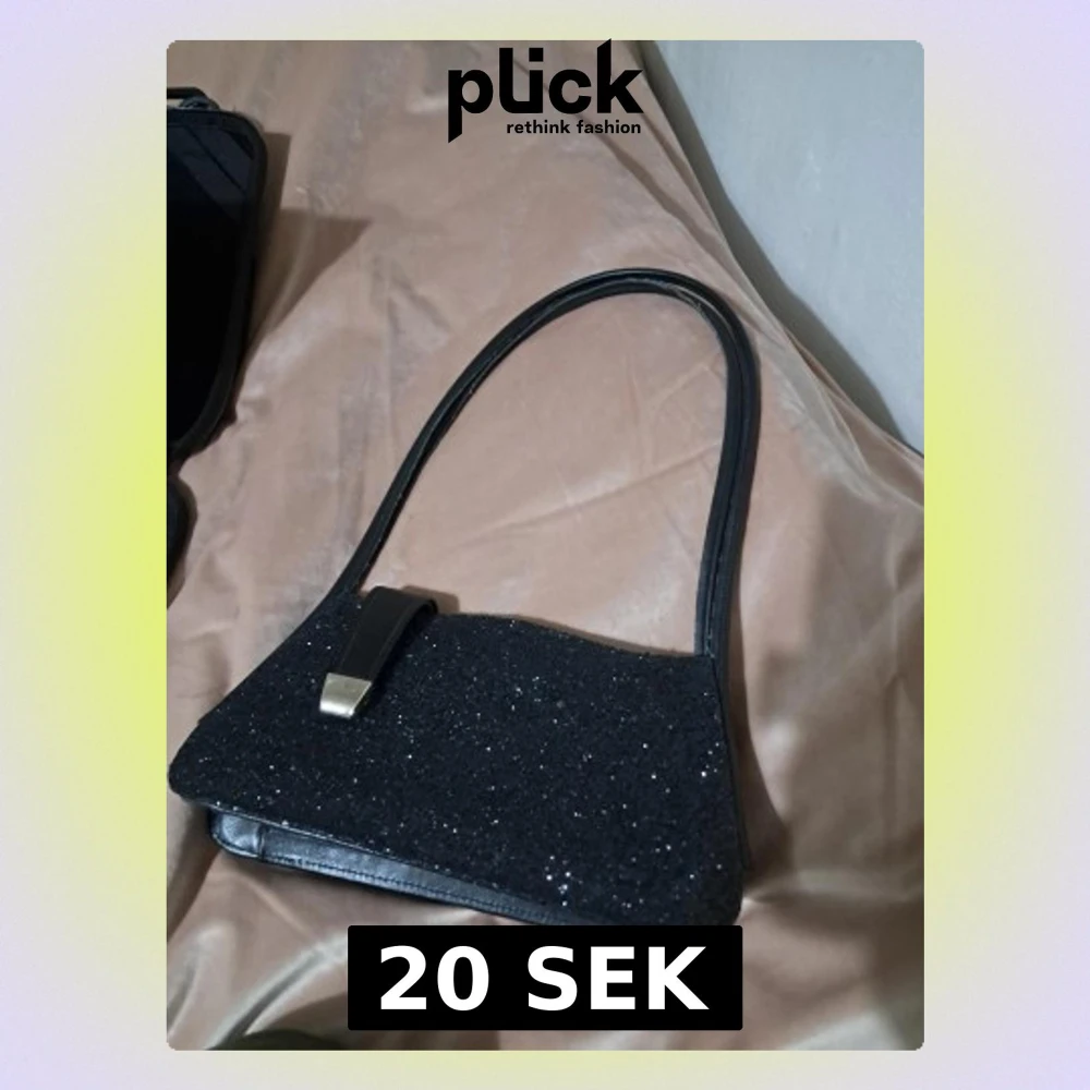 Snygg svart handväska med glittrig yta och stilren form. Väskan har en lång, smal axelrem i svart skinn och ett dekorativt spänne i silverfärg. Perfekt för dig som vill sticka ut med en elegant accessoar. Lite skador se bilder