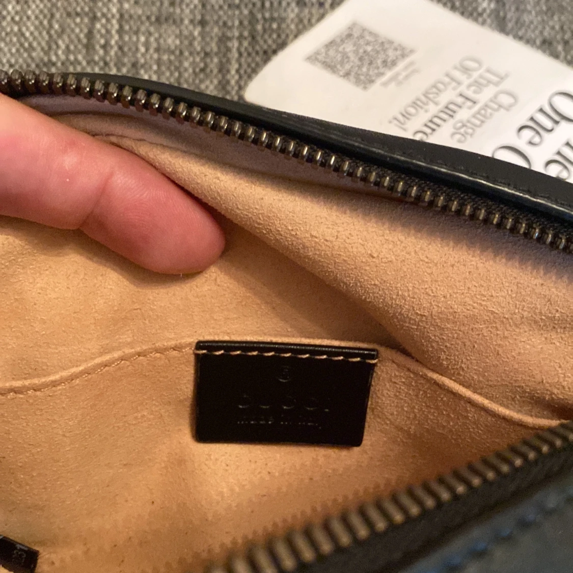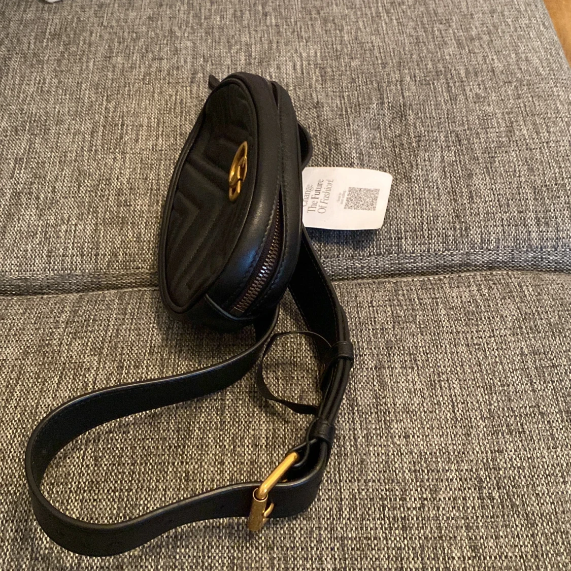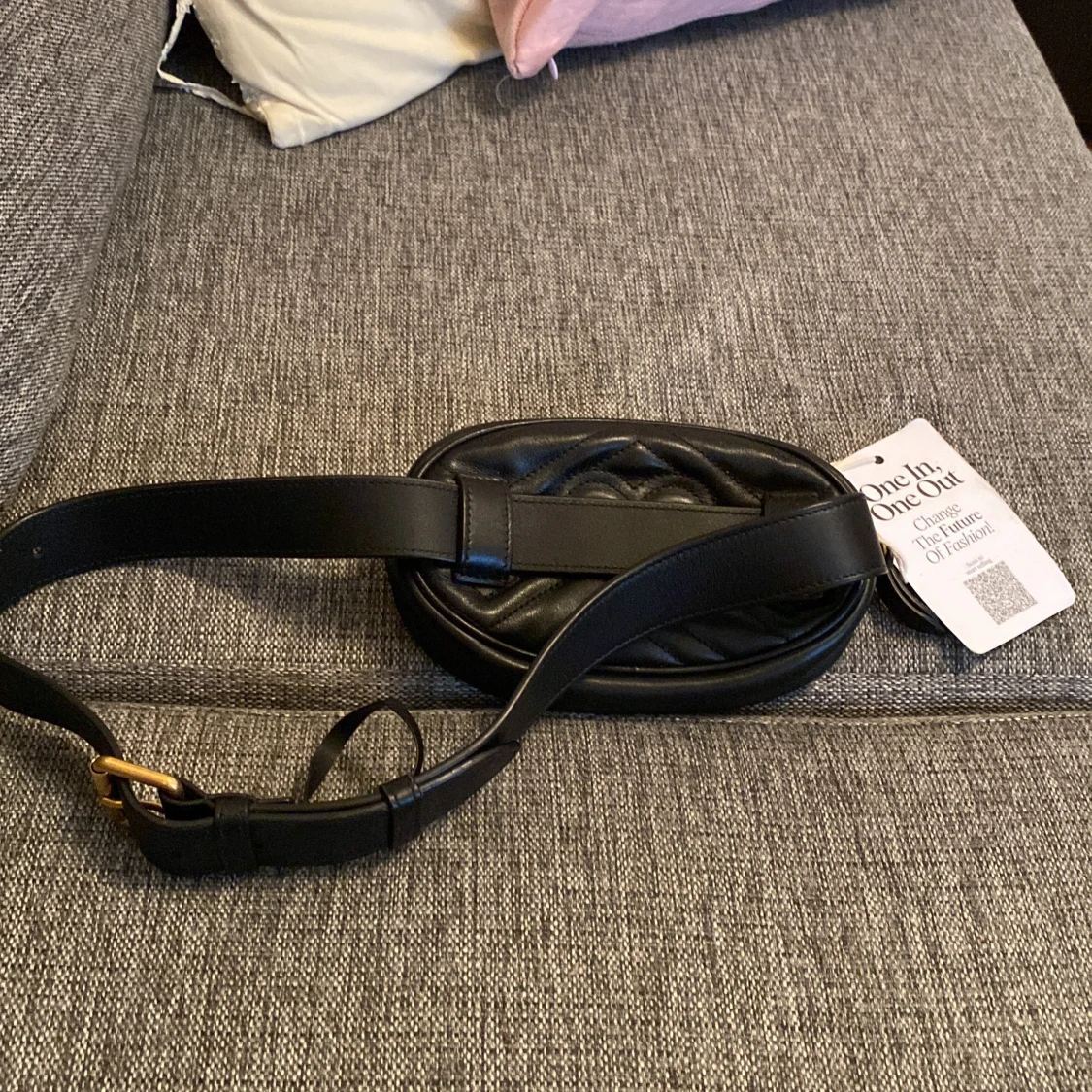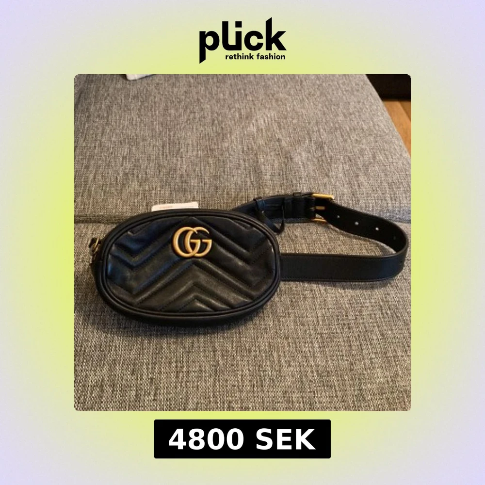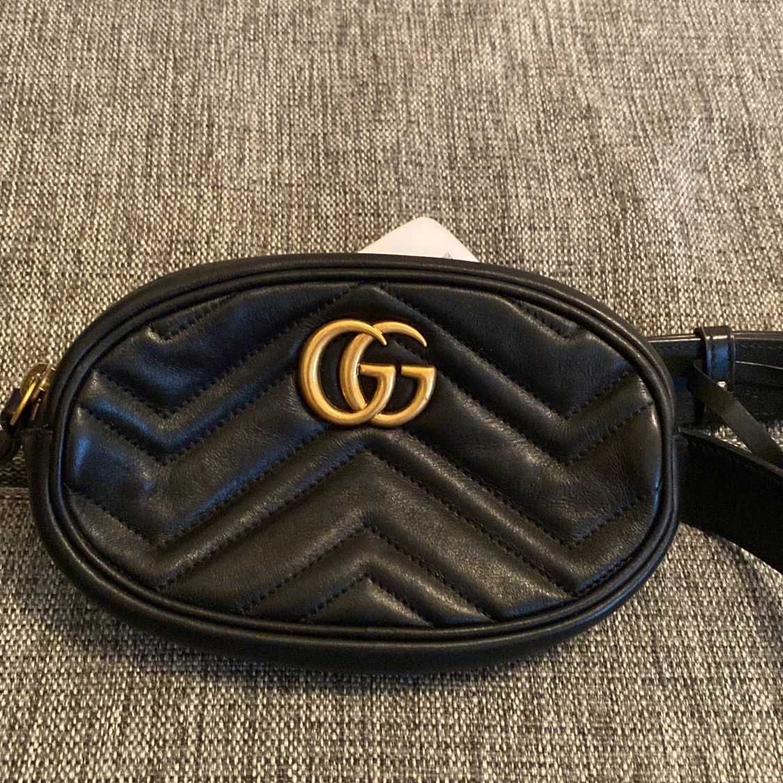 Snygg svart midjeväska från Gucci i mjukt skinn med guldiga GG-detaljer framtill. Väskan har quiltad yta med chevronmönster och justerbart bälte med guldfärgat spänne. Perfekt storlek för det viktigaste och stängs med dragkedja. Fungerar lika bra att hänga tvärs över axeln eller rakt från axeln. Köpt på Vestiaire Collective men aldrig använd. Som ny och har även genomgått äktighetsintyg. Bredd 18 cm, Höjd 11 cm, Djup 5 cm.