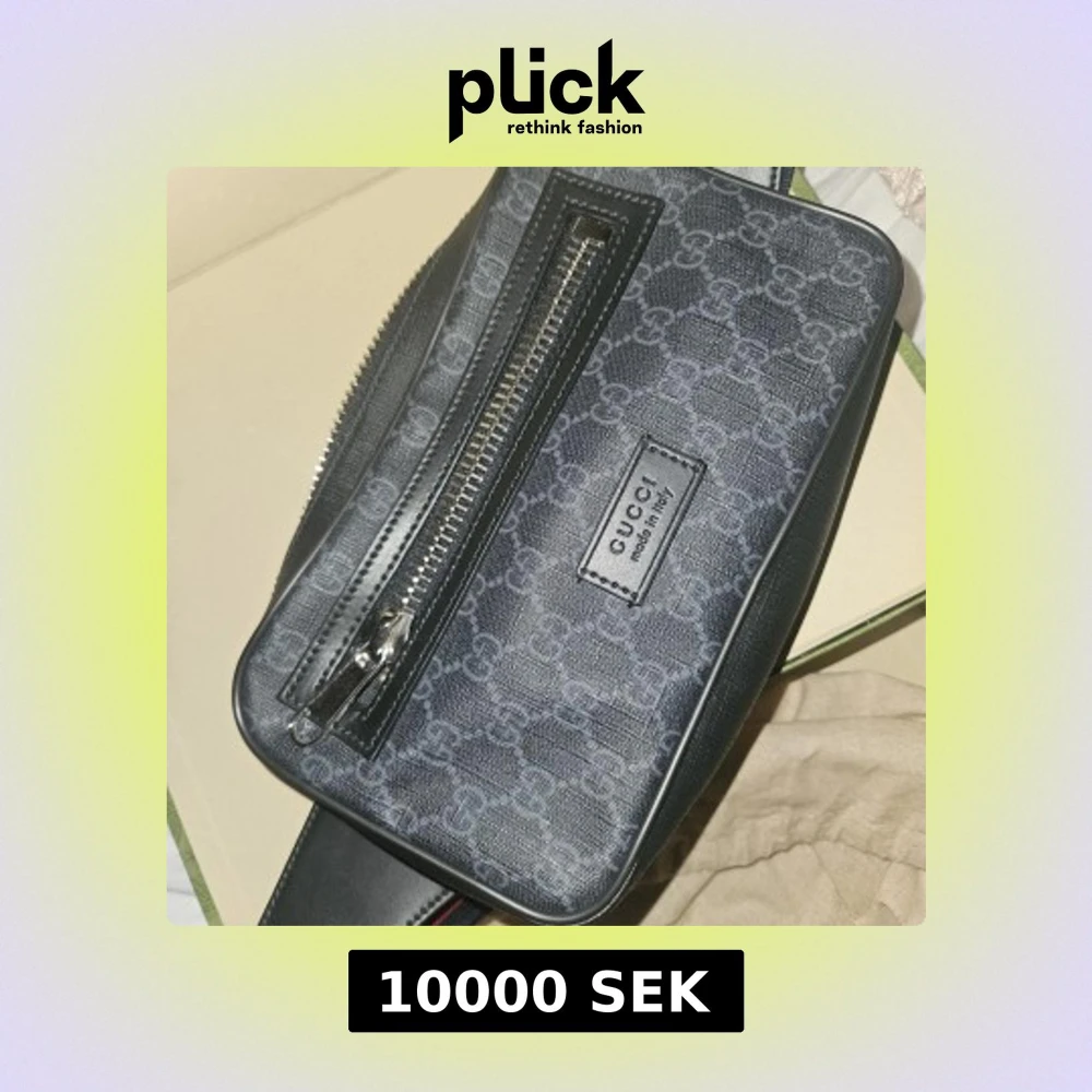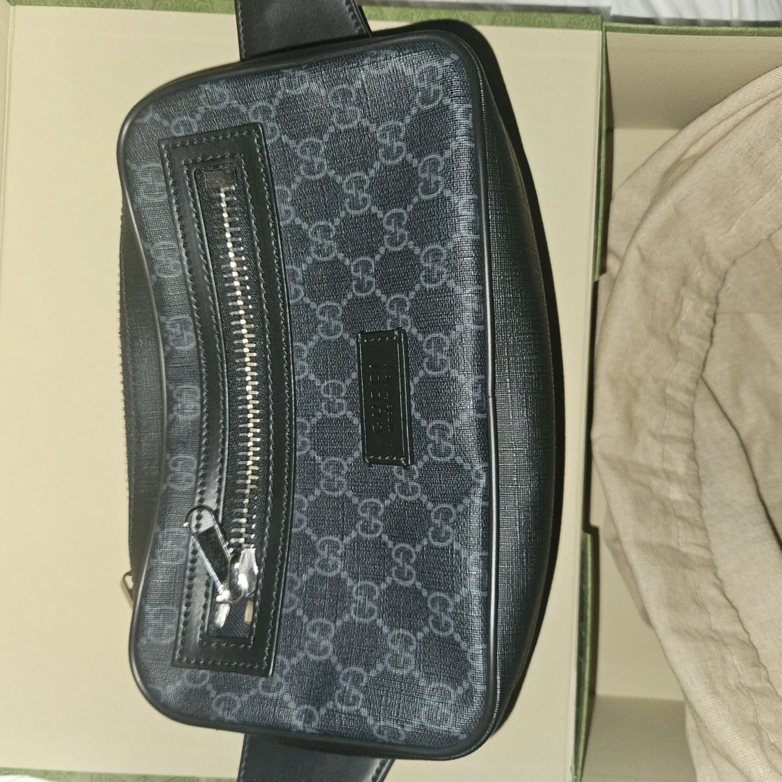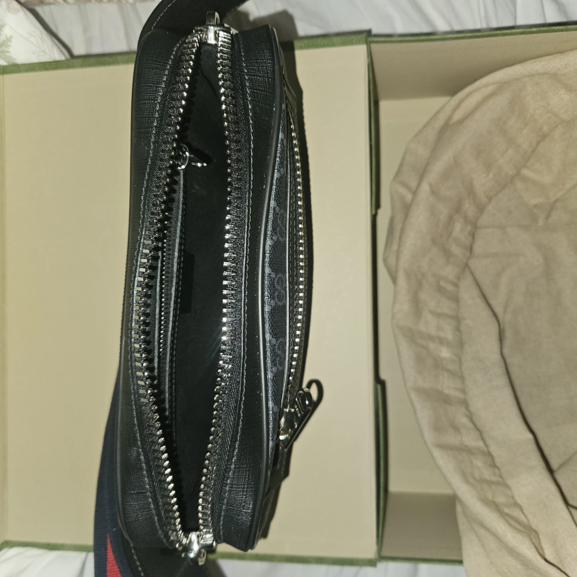 Säljer en original svart axelväska från Gucci med klassiskt GG-mönster i grått. Väskan har justerbar axelrem i rött och marinblått, silverfärgade dragkedjor och detaljer i skinn. Väskan är i nyskick, använd kanske 3 gånger. Kvitto finns. Pris i en gucci butik är ca 13 tusen kr. Mitt pris kan diskuteras vid snabb affär
