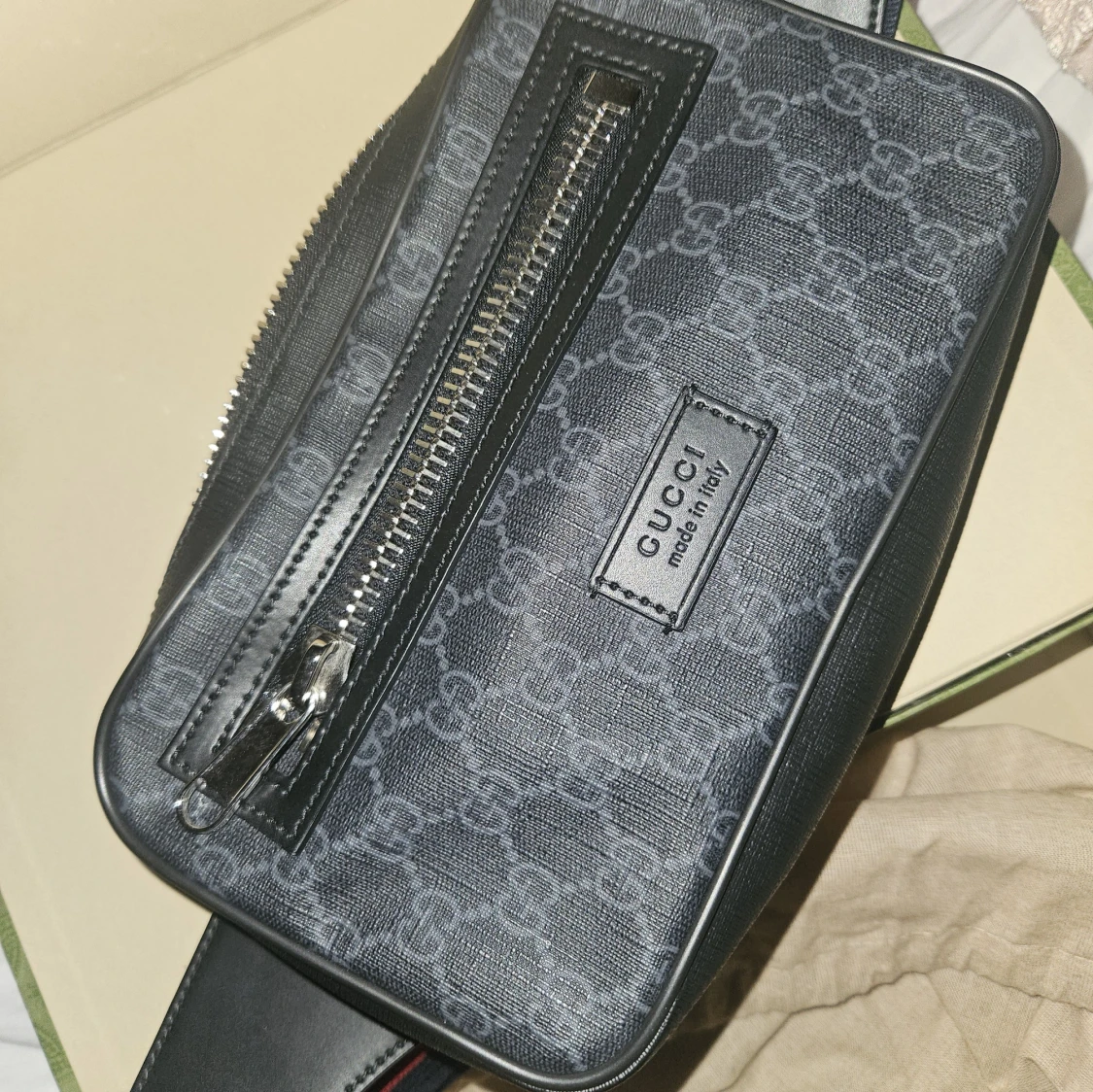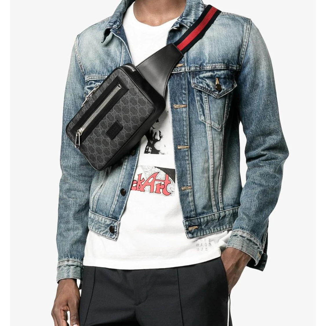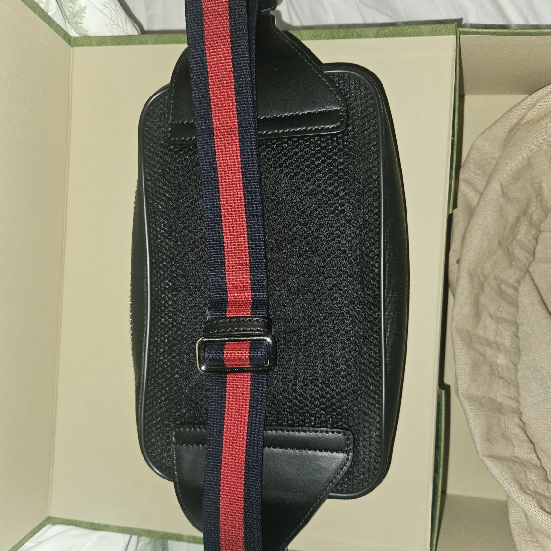 Säljer en original svart axelväska från Gucci med klassiskt GG-mönster i grått. Väskan har justerbar axelrem i rött och marinblått, silverfärgade dragkedjor och detaljer i skinn. Väskan är i nyskick, använd kanske 3 gånger. Kvitto finns. Pris i en gucci butik är ca 13 tusen kr. Mitt pris kan diskuteras vid snabb affär