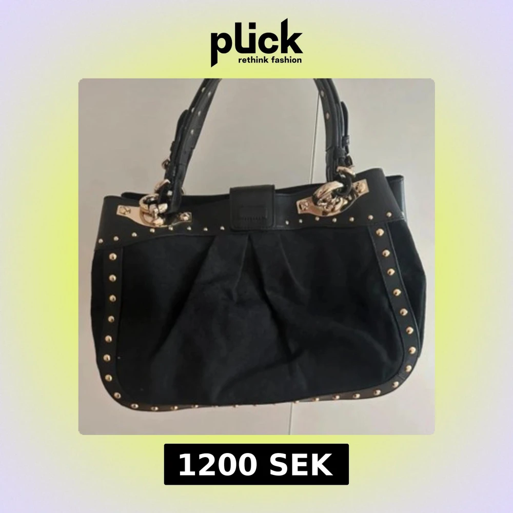 Snygg svart väska från DKNY med guldfärgade nitar och detaljer. Väskan har dubbla handtag i skinn och ett diskret mönster i tyget. Perfekt storlek för att få plats med allt du behöver