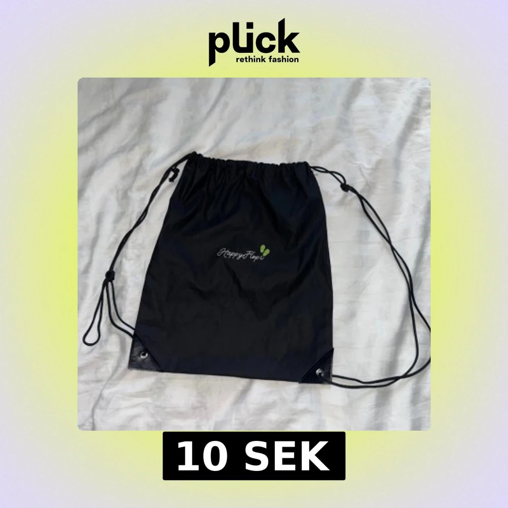 En svart gympåse med dragsko och logga från HappyFlops framtill. Väskan har tunna snören som axelband och förstärkta hörn nertill. Perfekt för att bära träningskläder eller skor. Enkel och stilren design med liten grön detalj vid loggan.