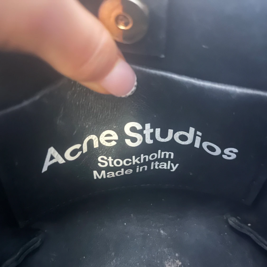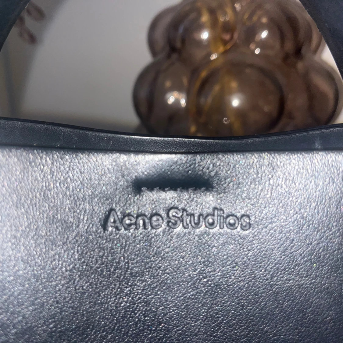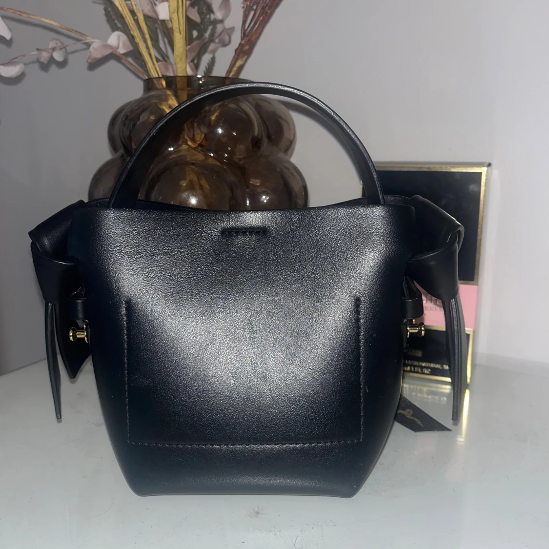Snygg svart handväska från Acne Studios i slätt skinn med stilren design och knutdetaljer på sidorna. Jättefint skick bara lite smutsig inuti. finns även en skinnrem/axelrem, skriv för bilder. kom med prisförslag!