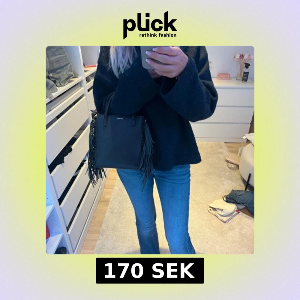 Säljer en svart fyrkantig handväska från Don Donna med coola fransar på sidorna. Väskan har både handtag och avtagbar axelrem så du kan bära den på flera sätt. Perfekt storlek för mobilen, plånboken och lite till.