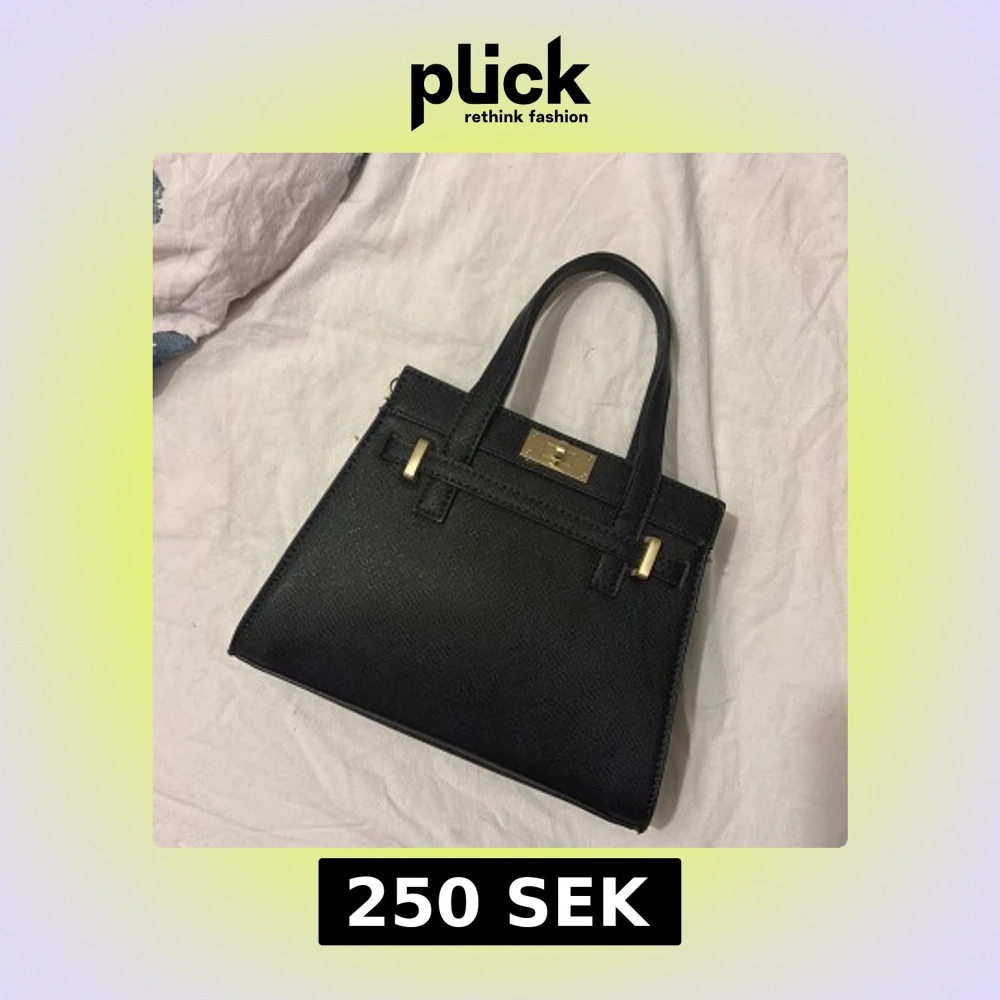 Stilren svart handväska från Bershka med guldfärgade metalldetaljer och strukturmönstrad yta. Väskan har både handtag och avtagbar axelrem, samt snyggt lås framtill. Perfekt för dig som gillar klassisk och trendig design.