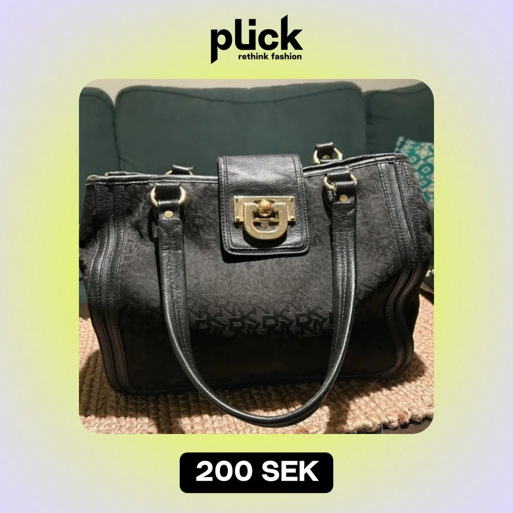 Snygg svart handväska från DKNY med ett monogrammönster. Väskan har guldfärgade detaljer och en stilren låsdetalj framtill. Perfekt för både vardag och fest! 🖤