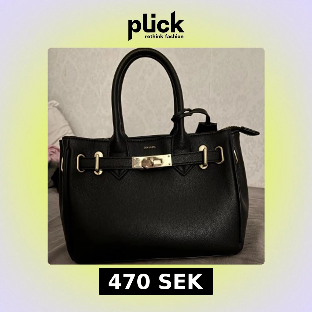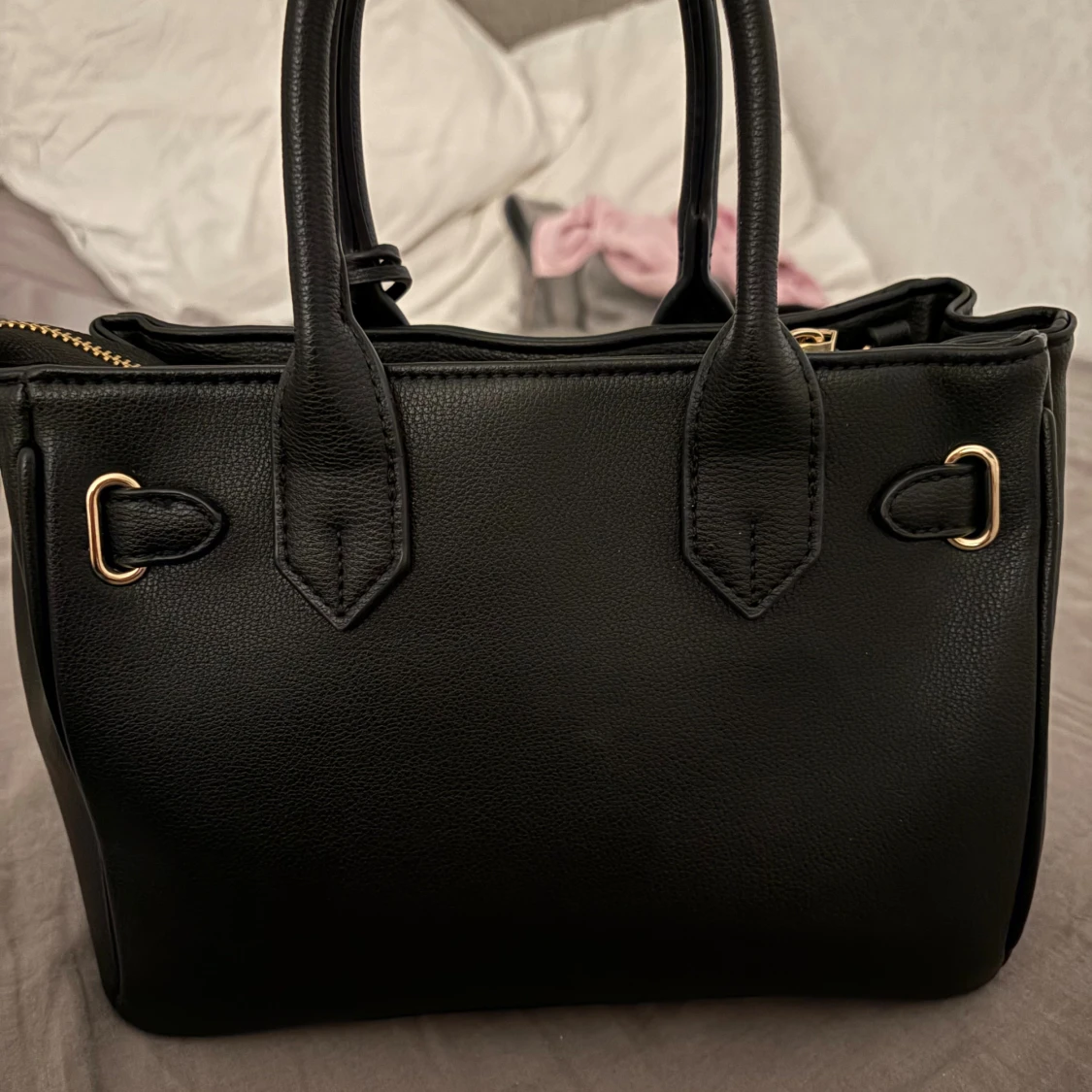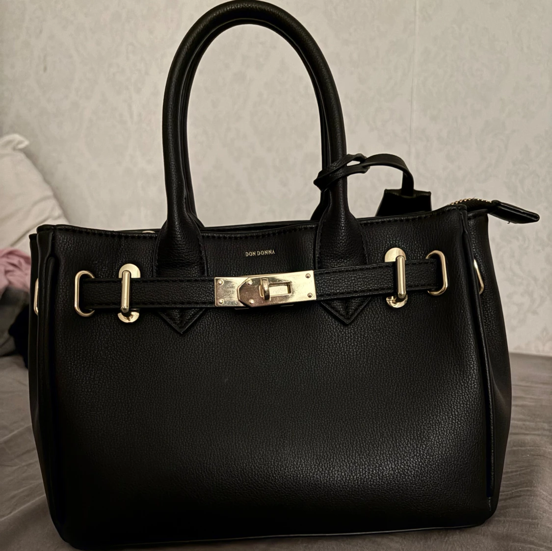 Stilren svart handväska från Don Donna i skinnimitation med guldfärgade metalldetaljer och lås framtill. Väskan har två rejäla handtag och dragkedja upptill. Perfekt storlek för att få plats med allt du behöver och ger en lyxig känsla till din outfit.