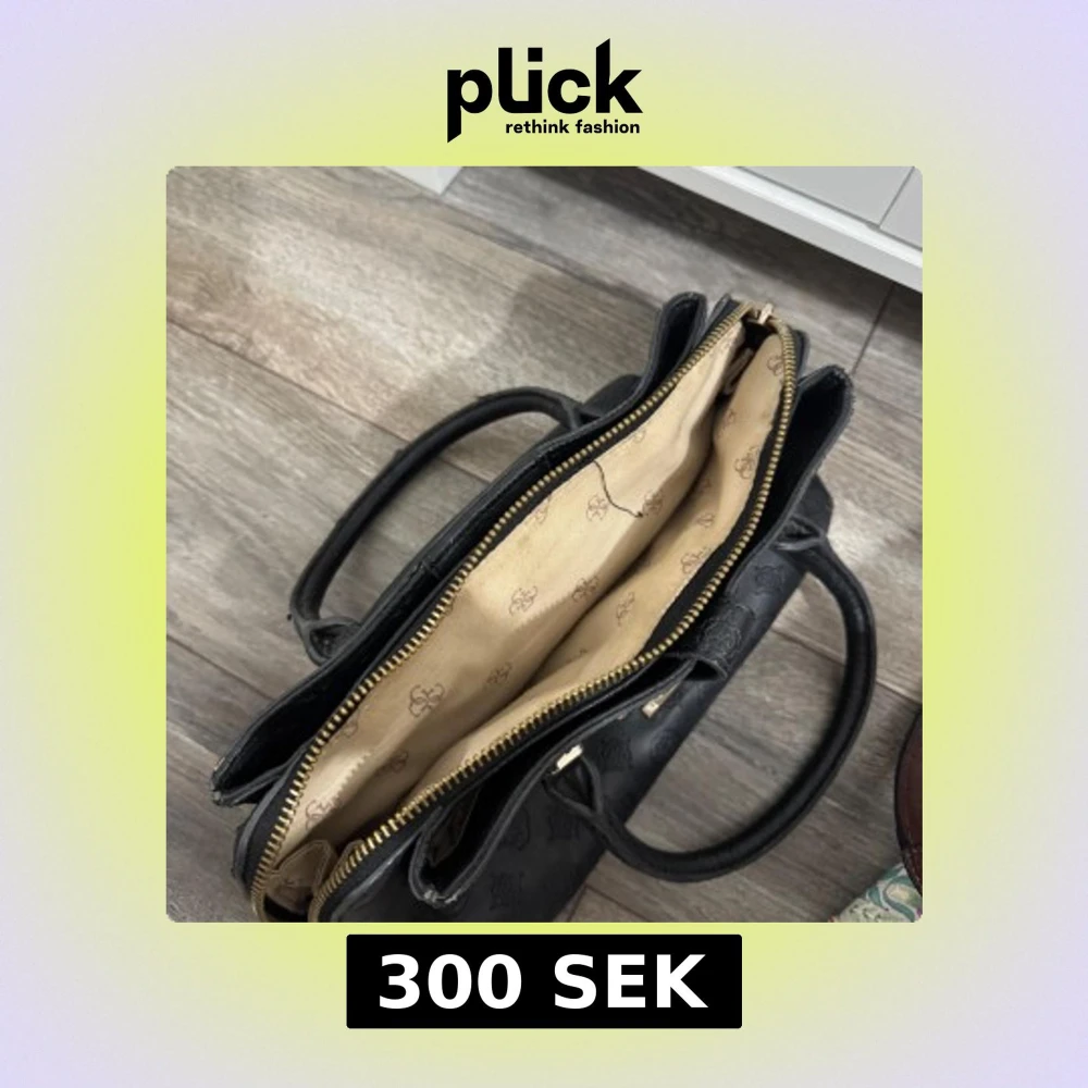 Säljer en svart handväska från Guess med guldfärgade metalldetaljer och präglat mönster över hela väskan. Väskan har dubbla handtag och dragkedja upptill. Perfekt för att bära dina viktigaste saker med stil.