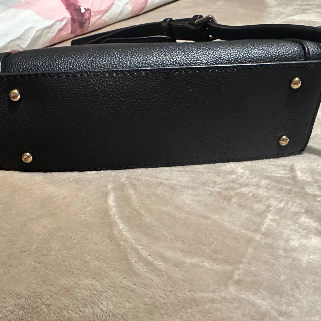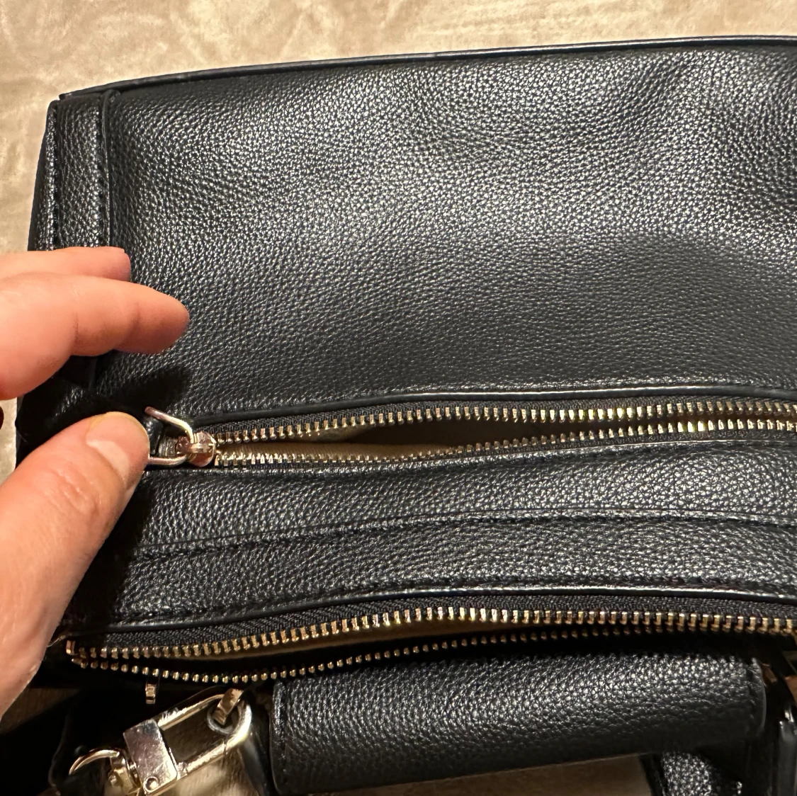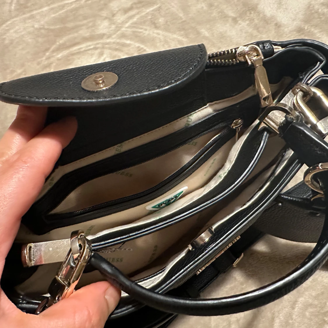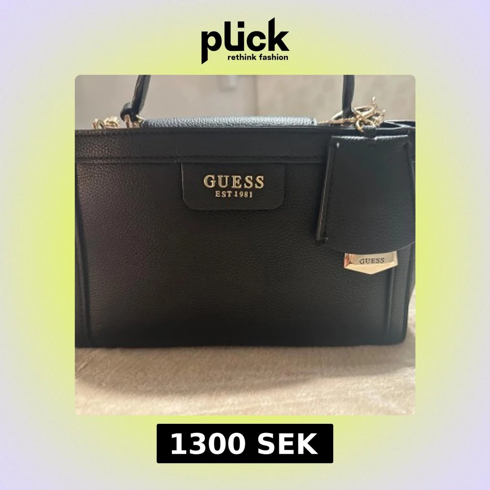 Snygg svart handväska från Guess med gulddetaljer och logotyp framtill. Väskan har flera fack inuti, dragkedja och justerbar axelrem. Perfekt för att bära dina viktigaste saker med stil.