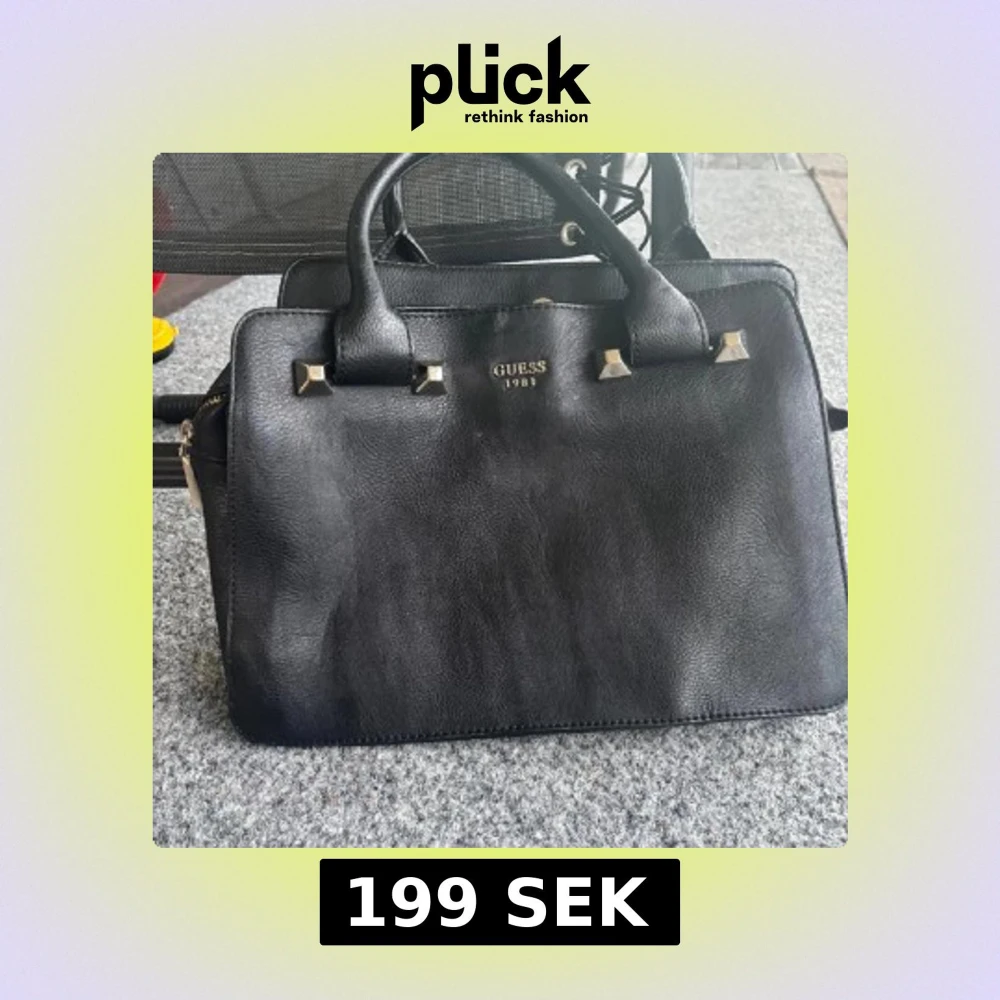 Stilren svart handväska från Guess med guldfärgade metalldetaljer och logga framtill. Väskan har två handtag, flera fack och dragkedja i mitten. Tillverkad i skinn med en klassisk, fyrkantig form som passar till många outfits. Se slitningar på bilderna😁 Använd gärna köp nu❤️