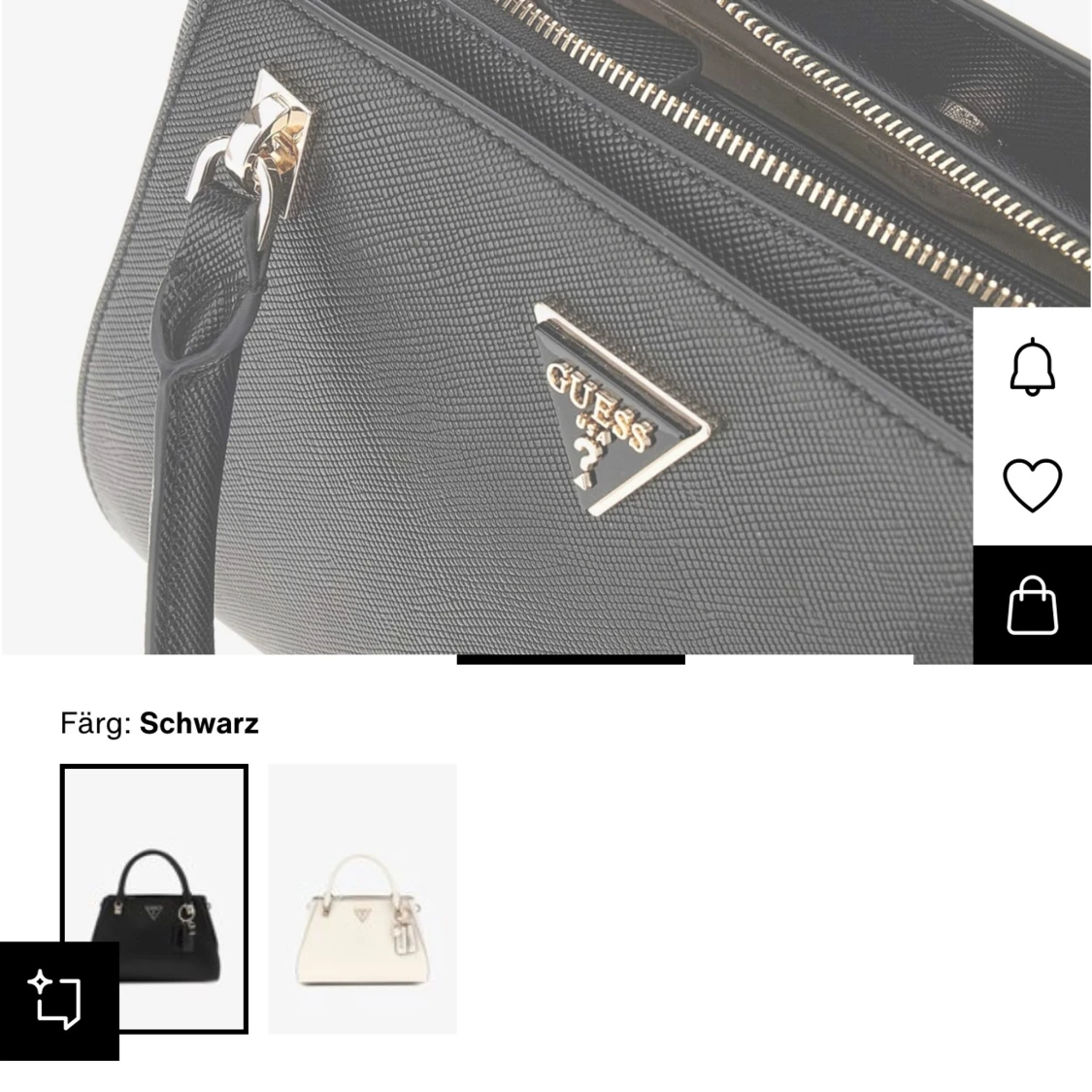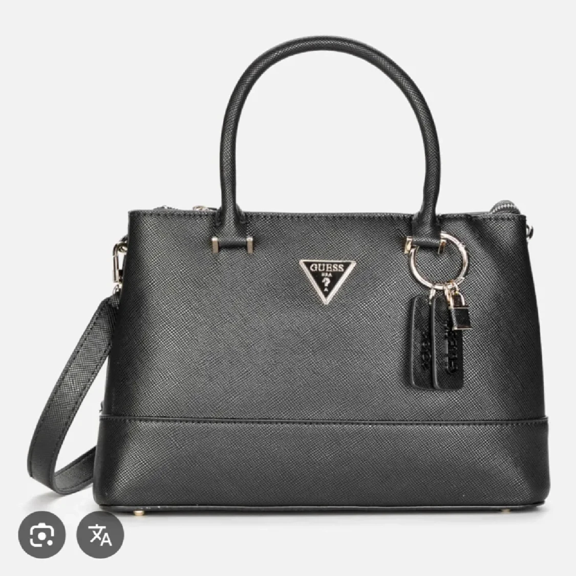 Stilren svart handväska från Guess med klassisk form, guldfärgade metalldetaljer och logga framtill. Väskan har både handtag och axelrem, dragkedja upptill och snygga detaljer som nyckelring och tag. Tillverkad i strukturerat skinnliknande material.