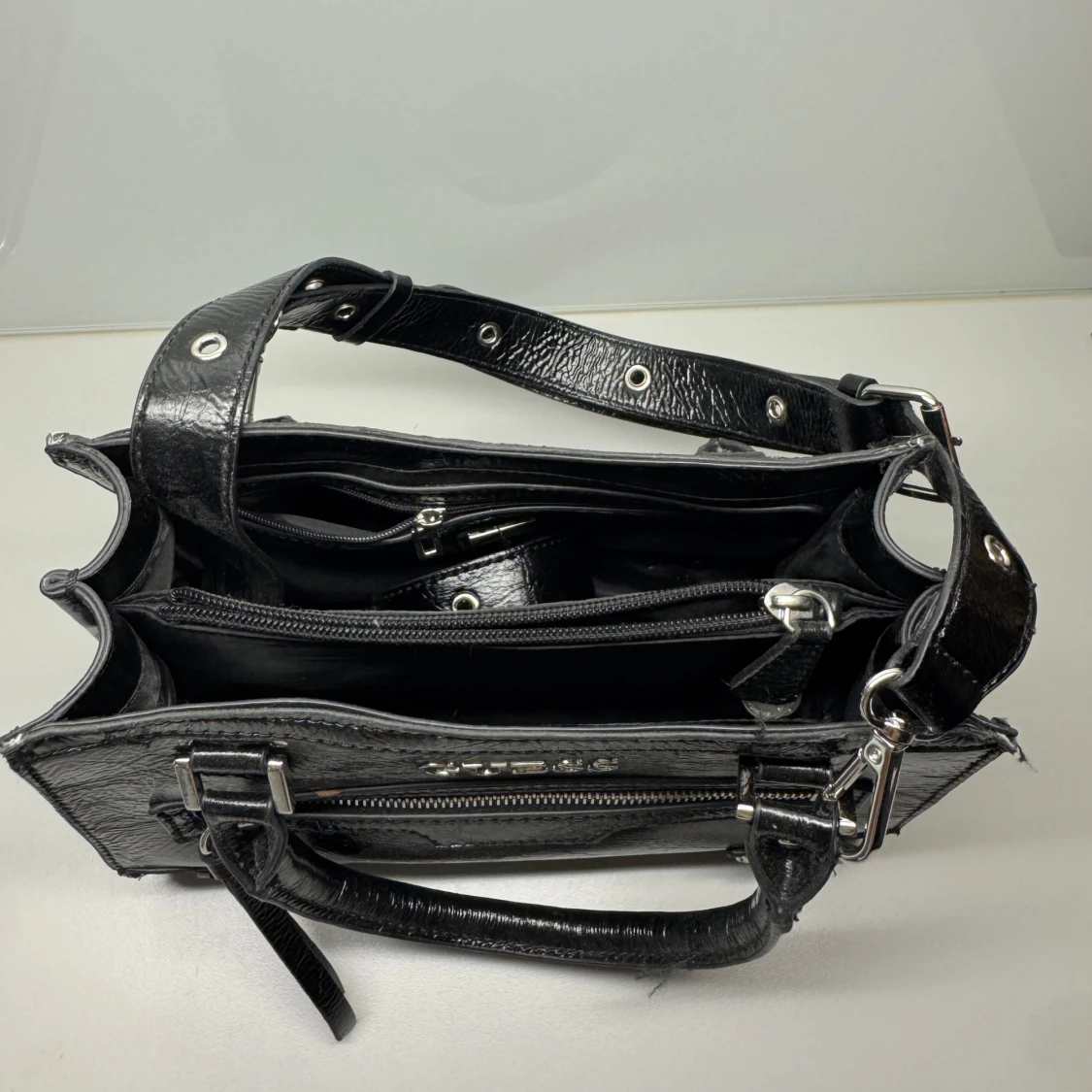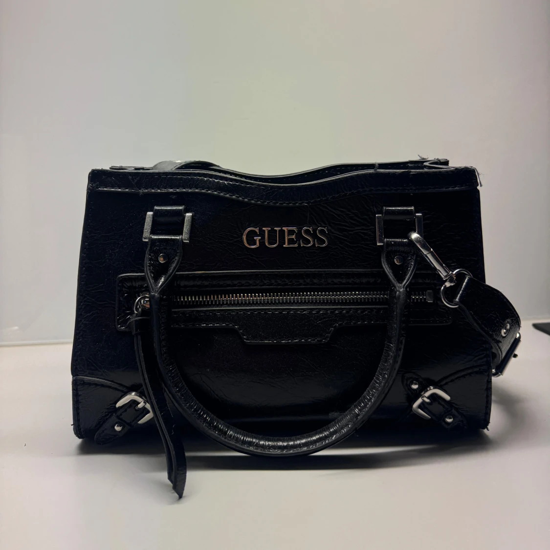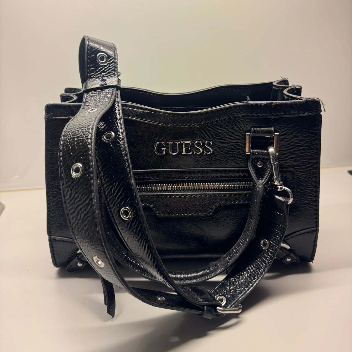 Snygg svart handväska från Guess i glansigt skinn med silvriga detaljer. Väskan har både handtag och justerbar axelrem, dragkedja framtill och flera fack inuti. Perfekt storlek till vardags, och rymmer väldigt mycket. Väldigt bra skick, knappt använt.