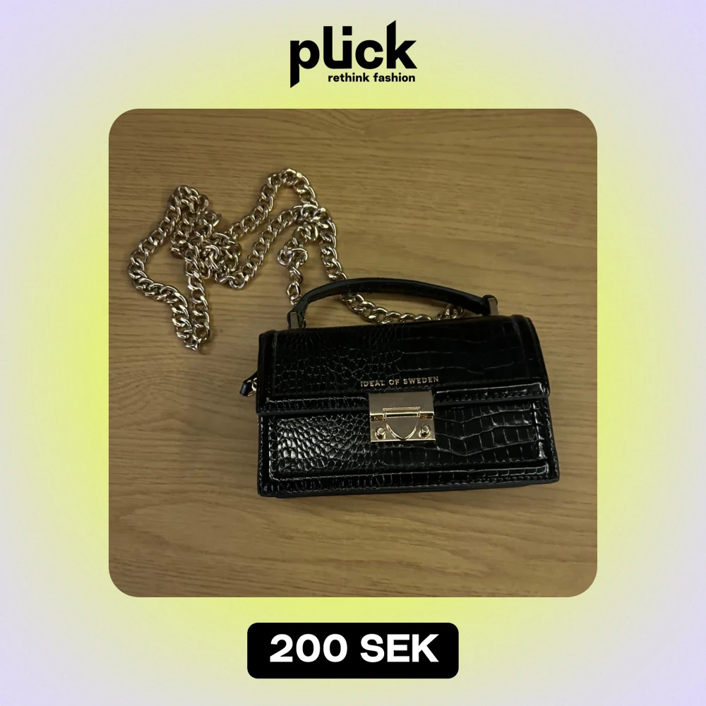 Snygg svart handväska i krokodilmönstrat skinn från Ideal of Sweden. Den har en elegant kedja i guld och ett stilrent lås framtill. Perfekt för en utekväll eller fest! 🖤