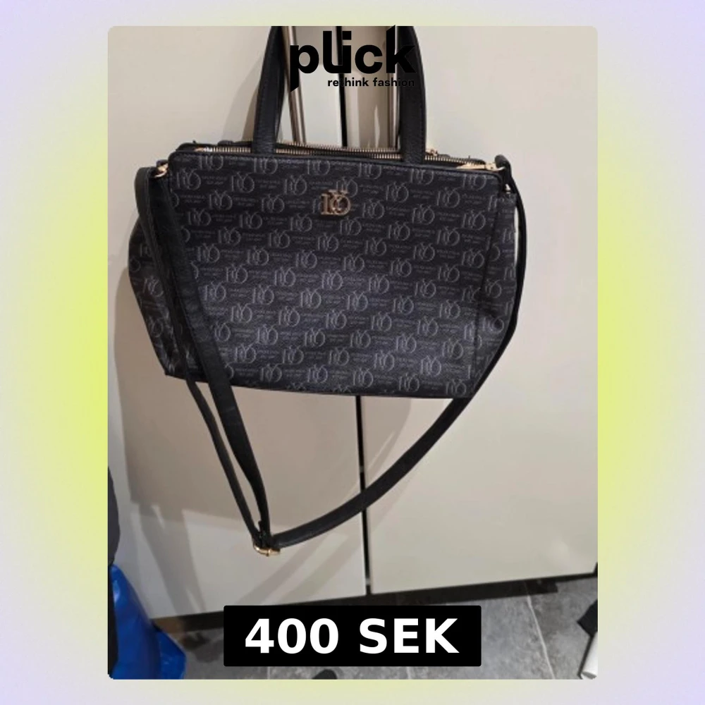 Snygg svart handväska från Lycke Oslo med justerbar axelrem och guldfärgade detaljer. Väskan har ett mönster med logotypen tryckt över hela ytan och flera praktiska fack med dragkedja. Materialet är skinnimitation och designen är stilren med både handtag och axelrem.