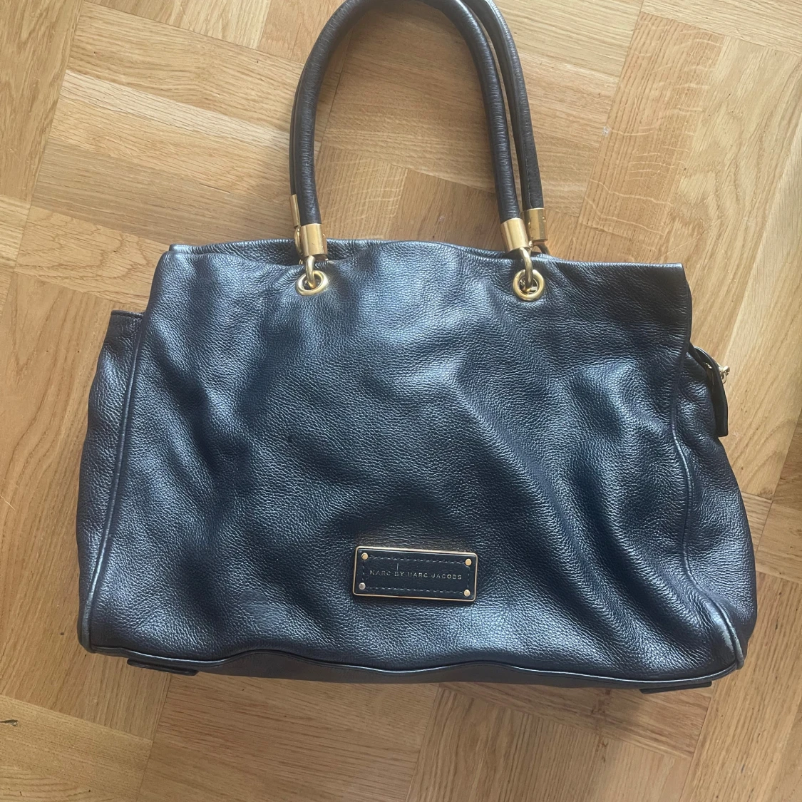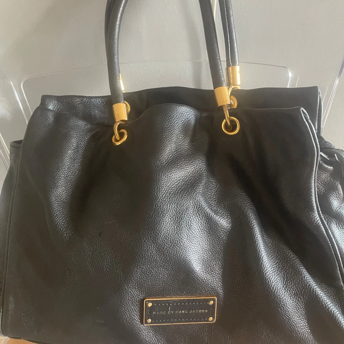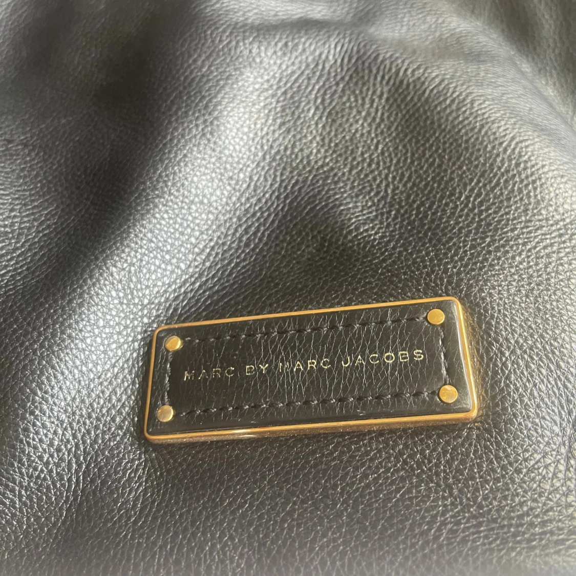 Snygg svart handväska från Marc by Marc Jacobs i äkta skinn med guldfärgade metalldetaljer. Väskan har två stadiga handtag, dekorativ logoplatta framtill och dragkedja med guldfärgad zip. Perfekt storlek för att få plats med allt du behöver.