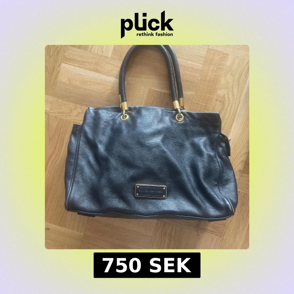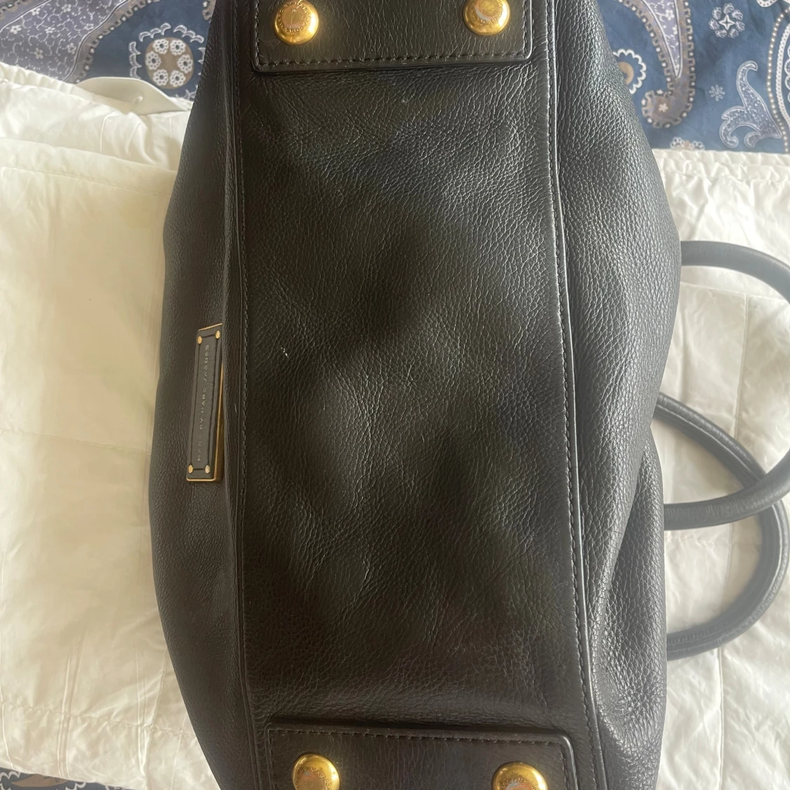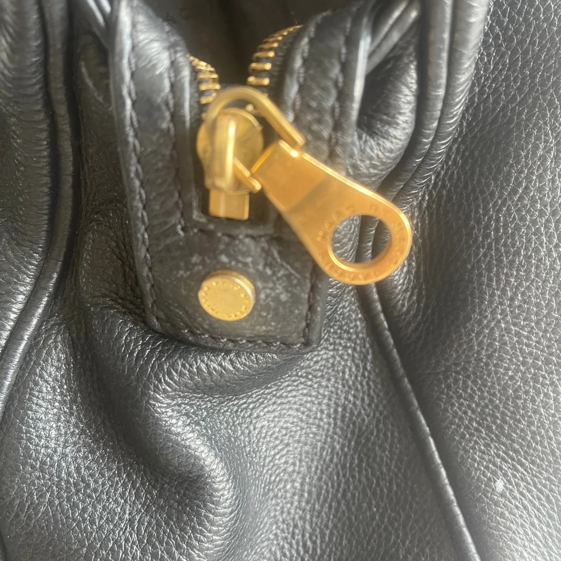Snygg svart handväska från Marc by Marc Jacobs i äkta skinn med guldfärgade metalldetaljer. Väskan har två stadiga handtag, dekorativ logoplatta framtill och dragkedja med guldfärgad zip. Perfekt storlek för att få plats med allt du behöver.