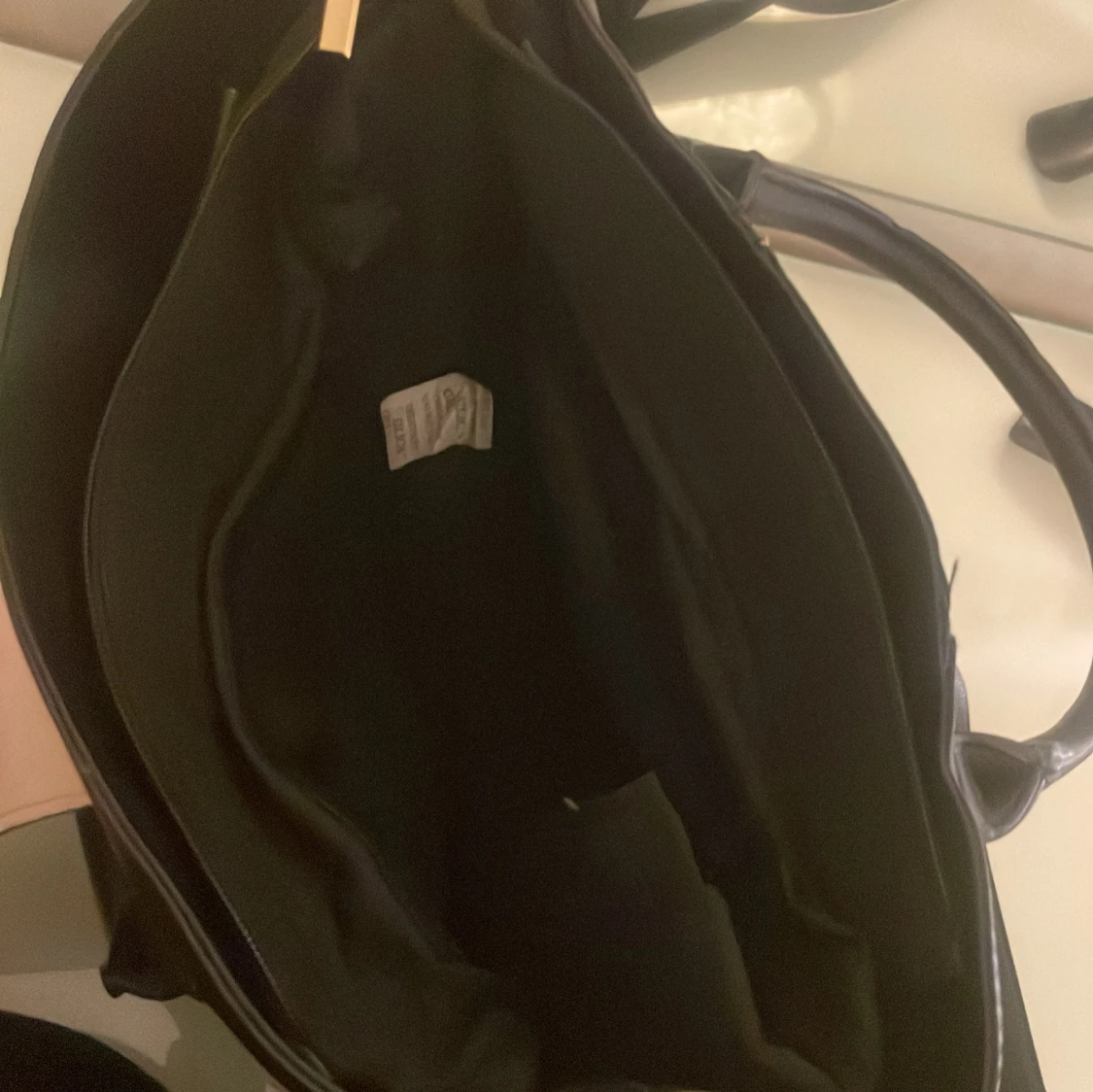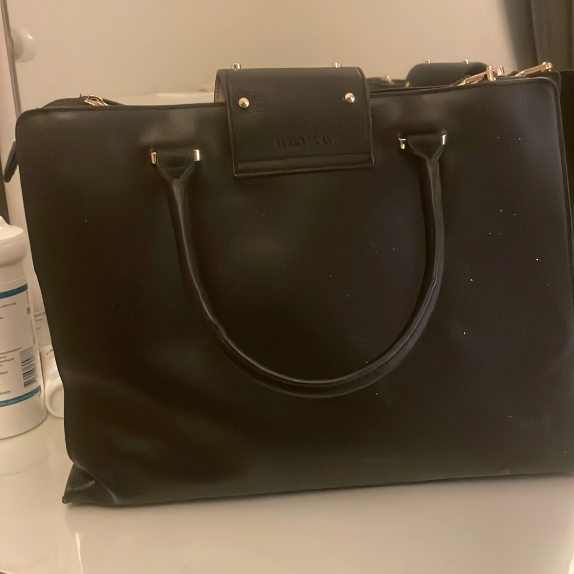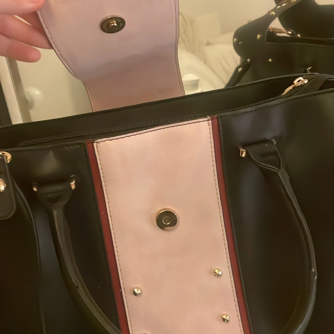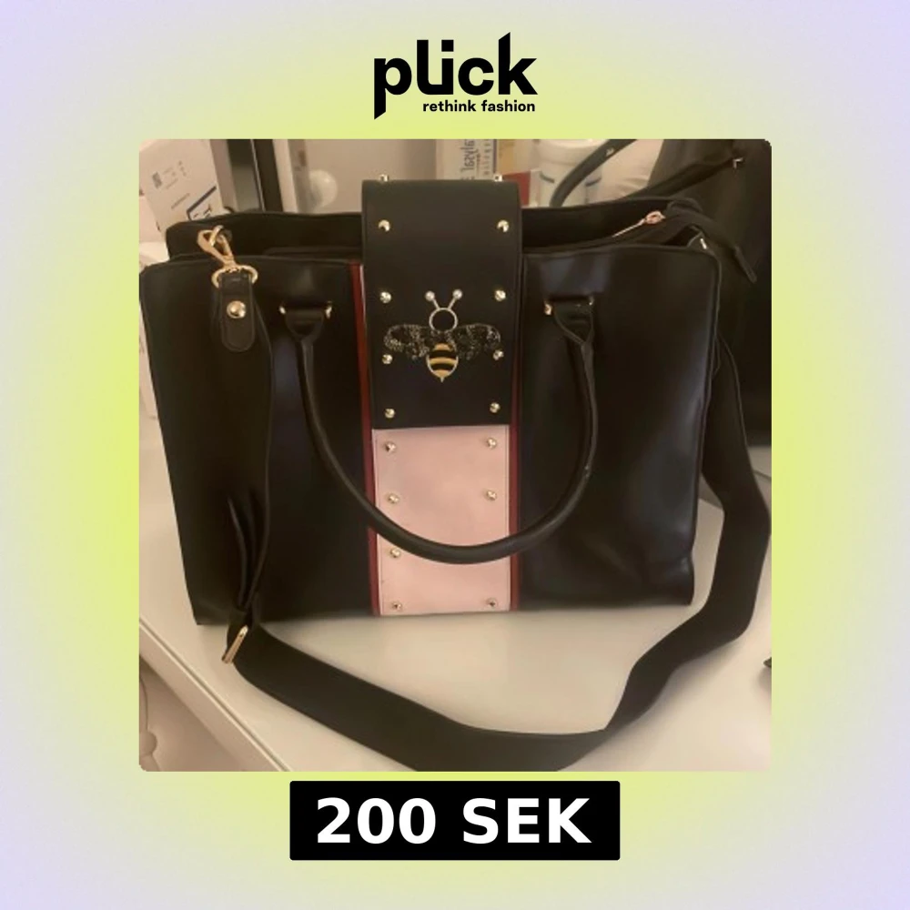 Stilren svart handväska från Mary Kay med rosa och röda detaljer framtill, dekorerad med en cool bi i metall och pärlor. Väskan har både handtag och axelrem, guldfärgade nitar och dragkedja upptill.