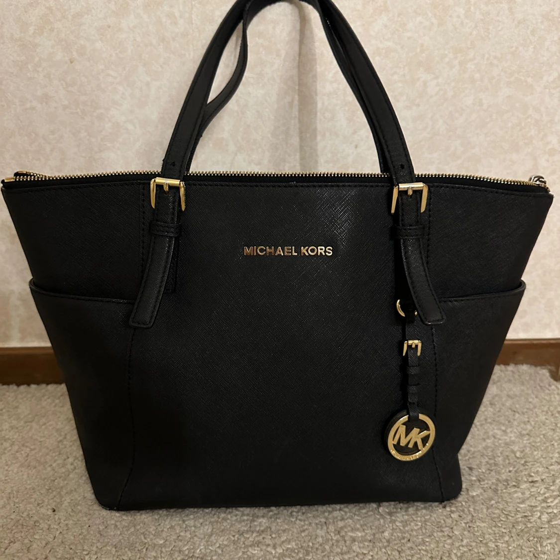 Snygg svart handväska från Michael Kors med guldfärgade detaljer och logotyp. Väskan har två handtag och en dragkedja upptill för säker förvaring. Perfekt för att bära dina dagliga nödvändigheter med stil. Perfekt skick förutom lite slitet på remmarna (se sista bilden). Pris kan diskuteras❣️