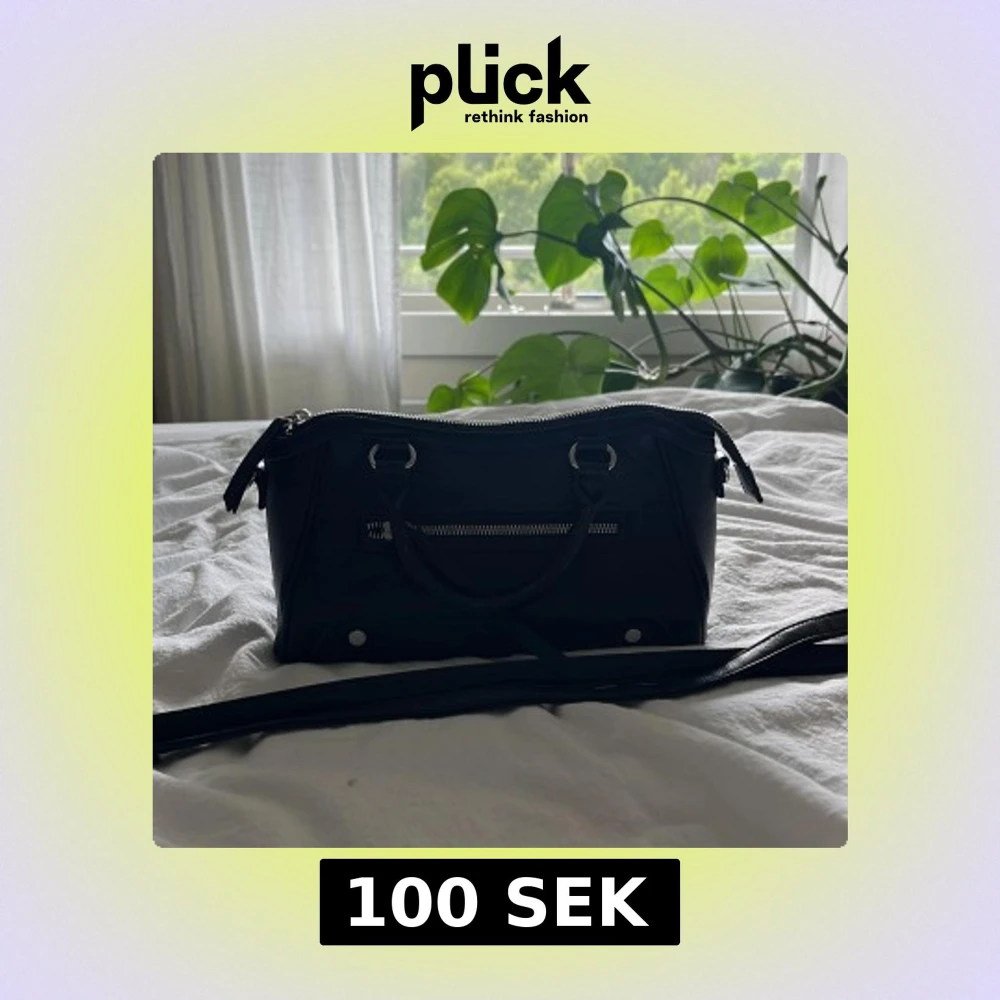 Snygg svart handväska från Primark med stilrena silverdetaljer och dragkedja framtill. Väskan har både handtag och lång axelrem, perfekt för att bära på olika sätt. Tillverkad i syntetmaterial med ett rymligt fack och innerficka med dragkedja.