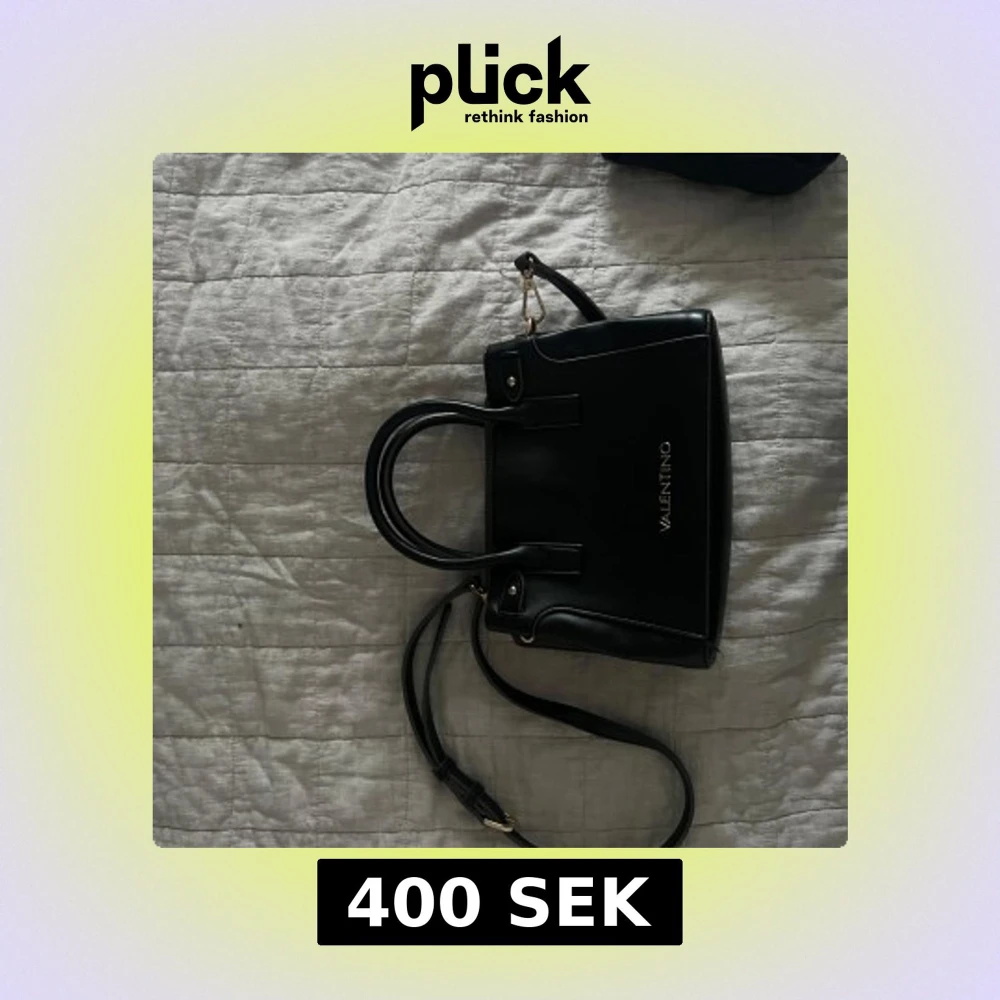 Snygg svart handväska från Valentino med både handtag och justerbar axelrem. Väskan har guldfärgade detaljer och stilren design med logga på framsidan. Perfekt för att bära dina viktigaste saker med stil.