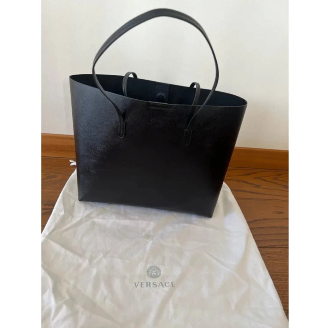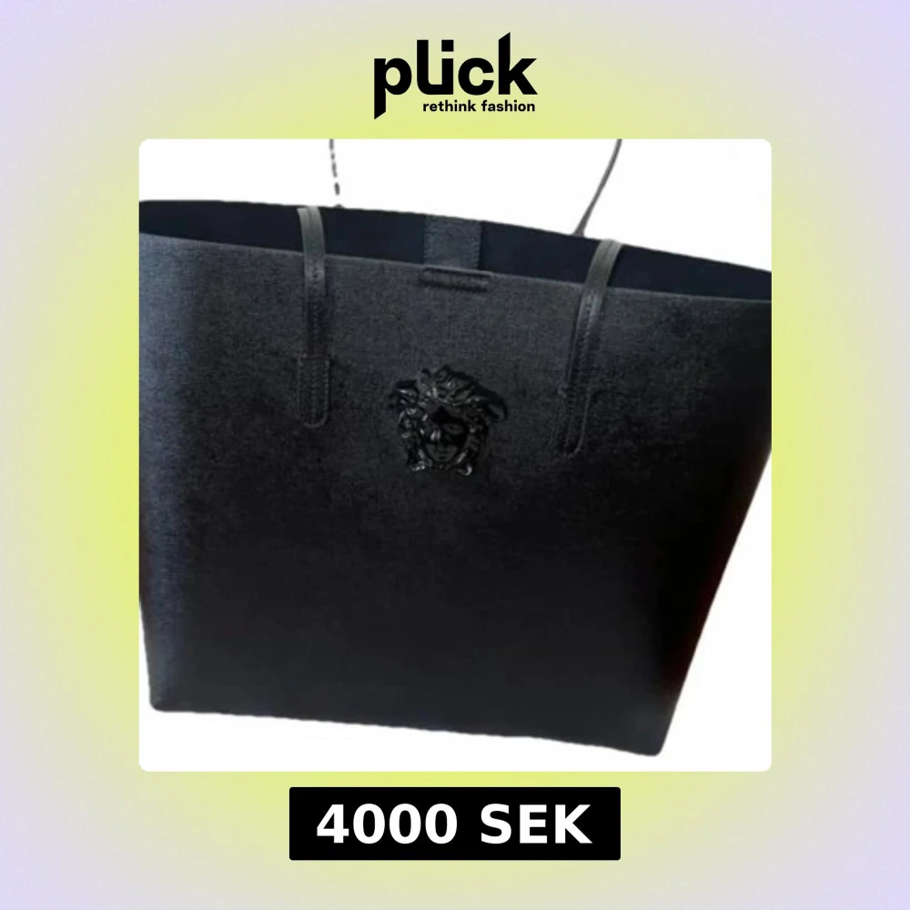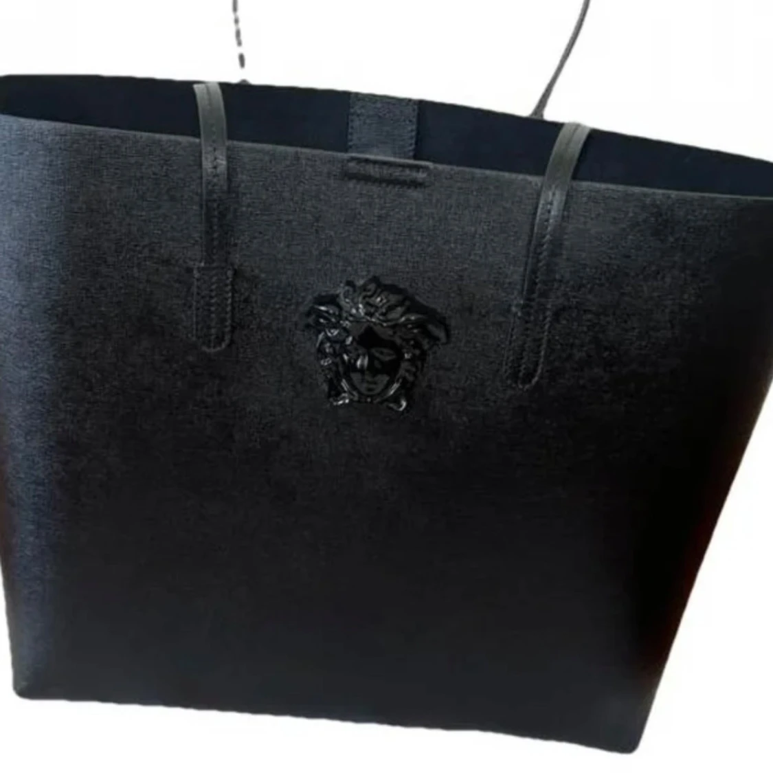 Säljer en stilren svart handväska från Versace med klassisk Medusa-detalj framtill. Väskan är rymlig med två handtag och tillverkad i skinn. Perfekt för dig som vill ha en lyxig accessoar till vardagen.