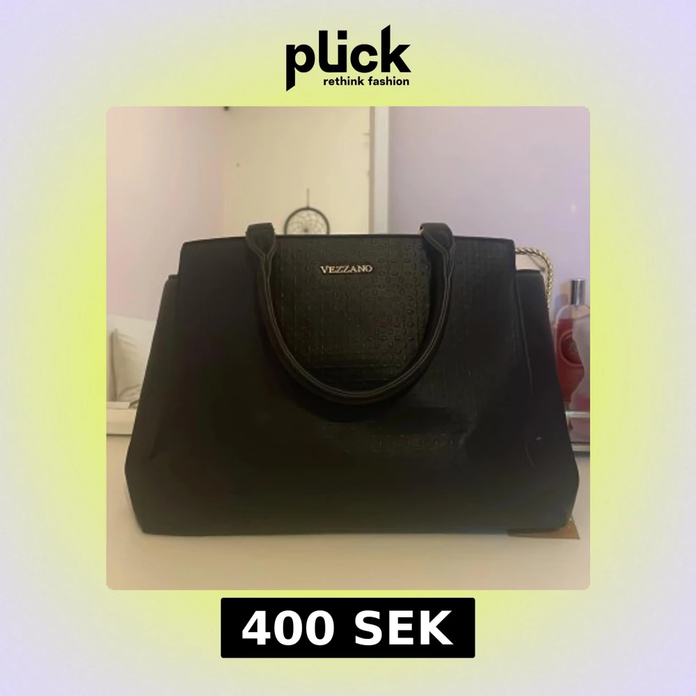 Snygg svart handväska från Vezzano med stilren design och strukturmönstrad yta. Väskan har två rejäla handtag och guldfärgad logga framtill. Perfekt för dig som vill ha en klassisk och rymlig väska i skinnimitation.
