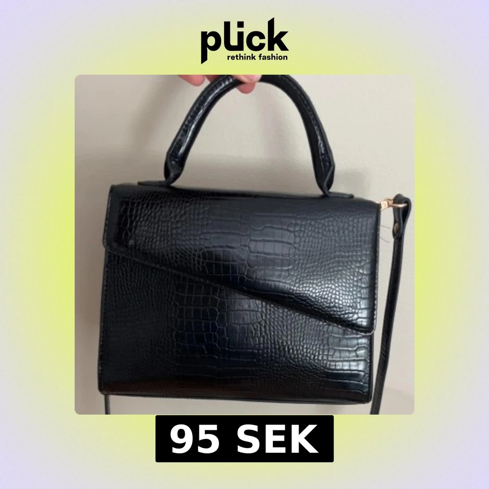 Stilren svart handväska med croco-mönstrad yta och elegant handtag. Väskan har en asymmetrisk lockdesign och avtagbar axelrem i samma material. Perfekt för dig som gillar en klassisk look med modern twist.
