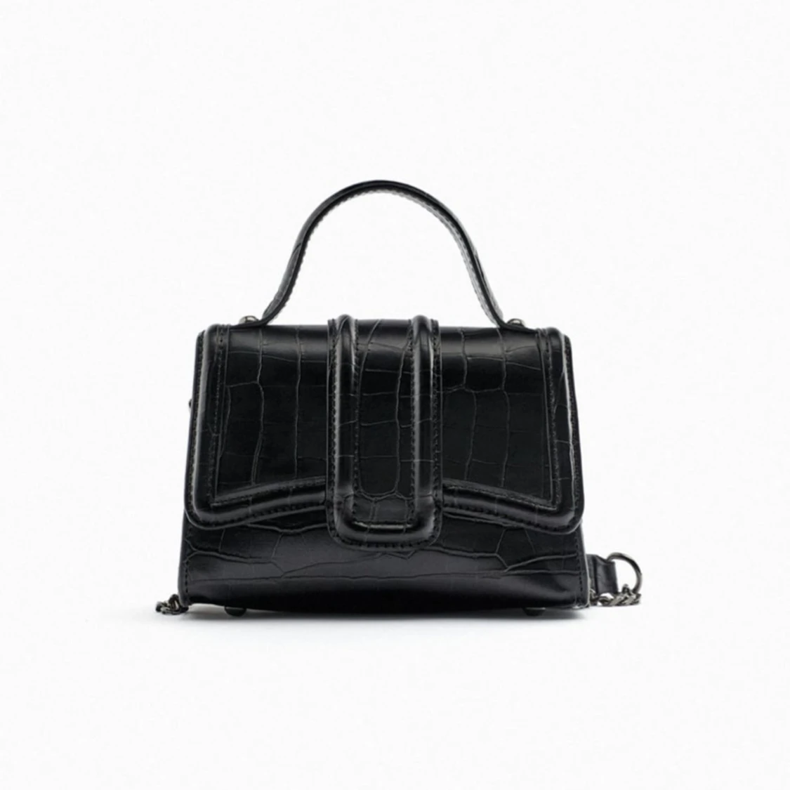 Snygg svart handväska med krokodilmönster och ett praktiskt handtag. Väskan har en stilren design med en lockstängning och en avtagbar axelrem i kedja. Perfekt för att ge din outfit en elegant touch.
