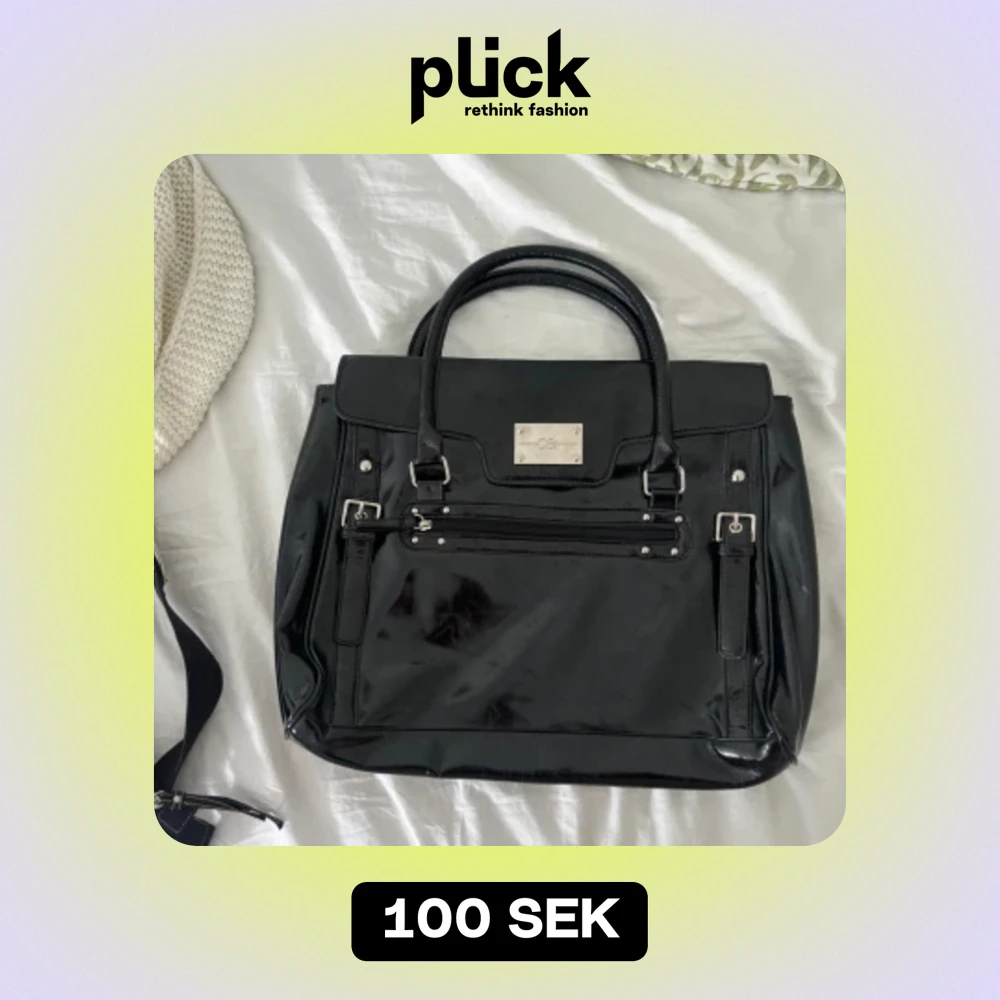 En elegant svart handväska i lack med två handtag och en dekorativ metallplatta på framsidan. Väskan har en dragkedja och får plats med tex en laptop.