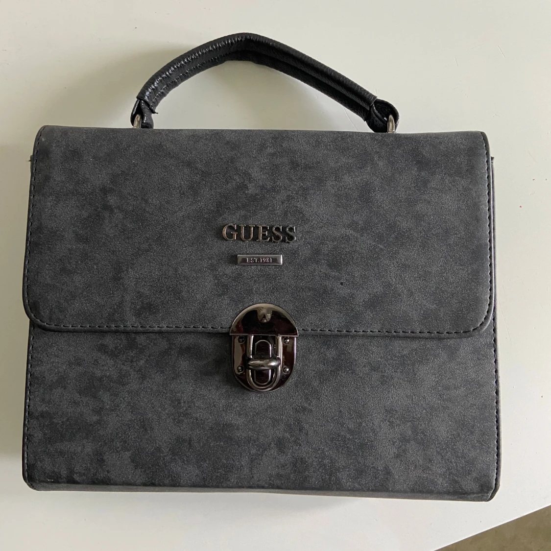 Stilren svart handväska från Guess i mjuk mocka med silverfärgat lås framtill och ett smidigt handtag. Klassisk fyrkantig form och diskret Guess-logga på framsidan. Perfekt för dig som gillar en clean och tidlös look.
