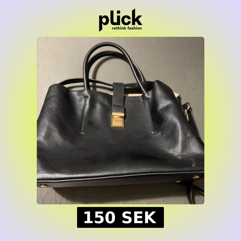 Stilren svart handväska i skinn med två handtag och axelrem. Väskan har guldfärgat spänne framtill och dragkedja på insidan. Insidan är ljusbeige och rymlig, perfekt för att få plats med allt du behöver. Klassisk och snygg design som passar till många outfits.