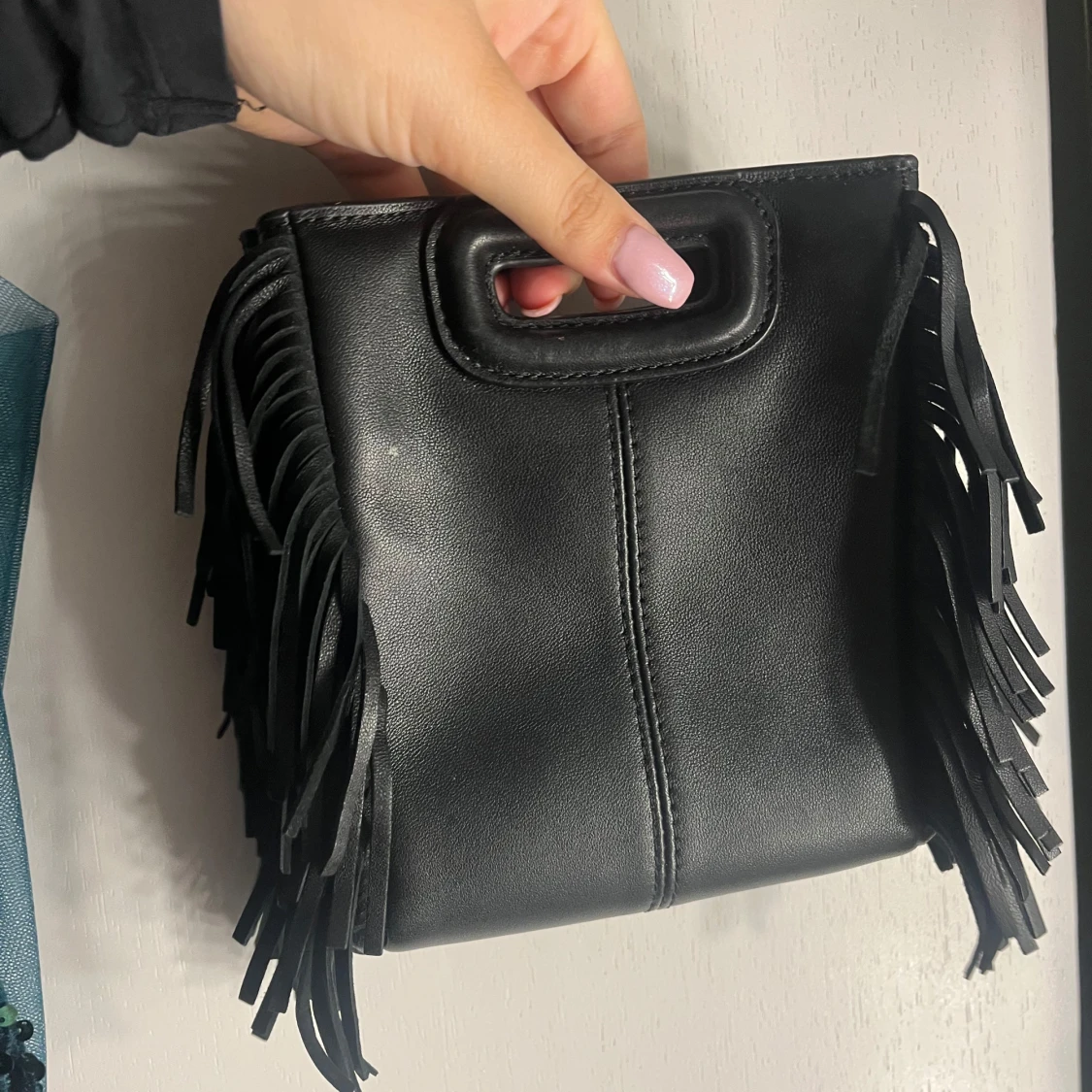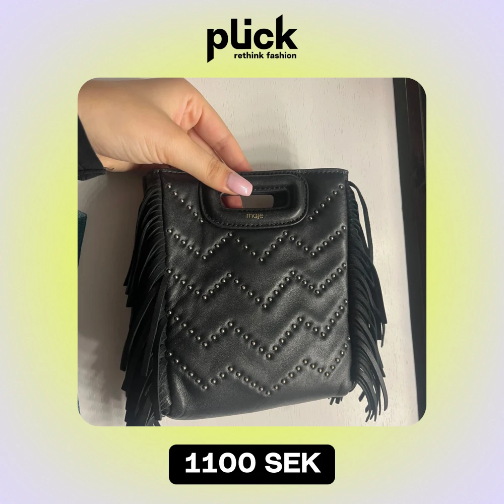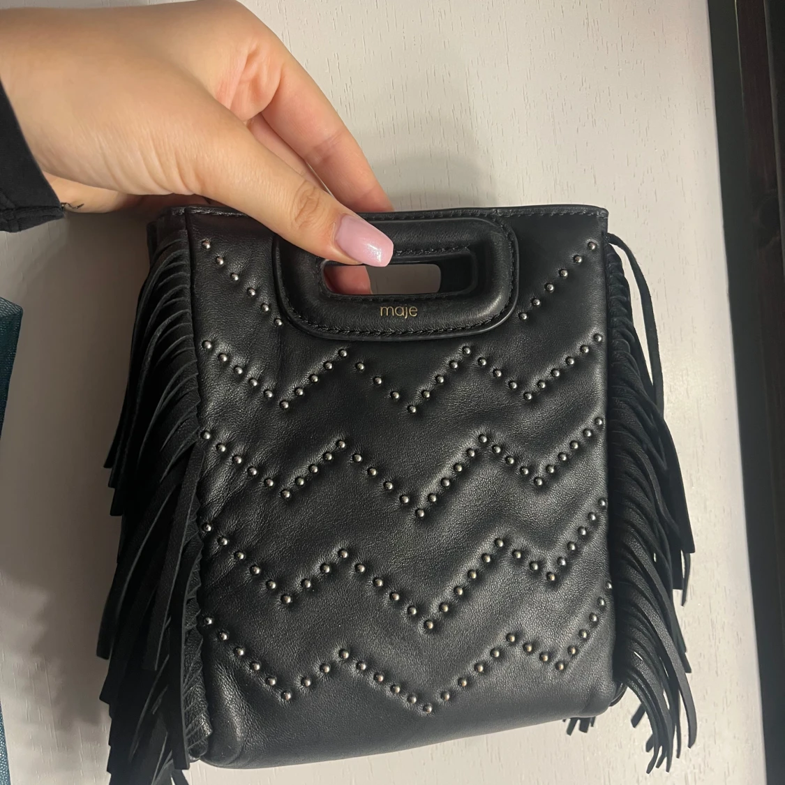 Snygg svart handväska från Maje i skinn med coola fransar på sidorna. Väskan har ett quiltat mönster med små nitar och ett praktiskt handtag upptill. Perfekt för en kväll ute eller en dag på stan! Orginalband medföljer, inga skambud❤️