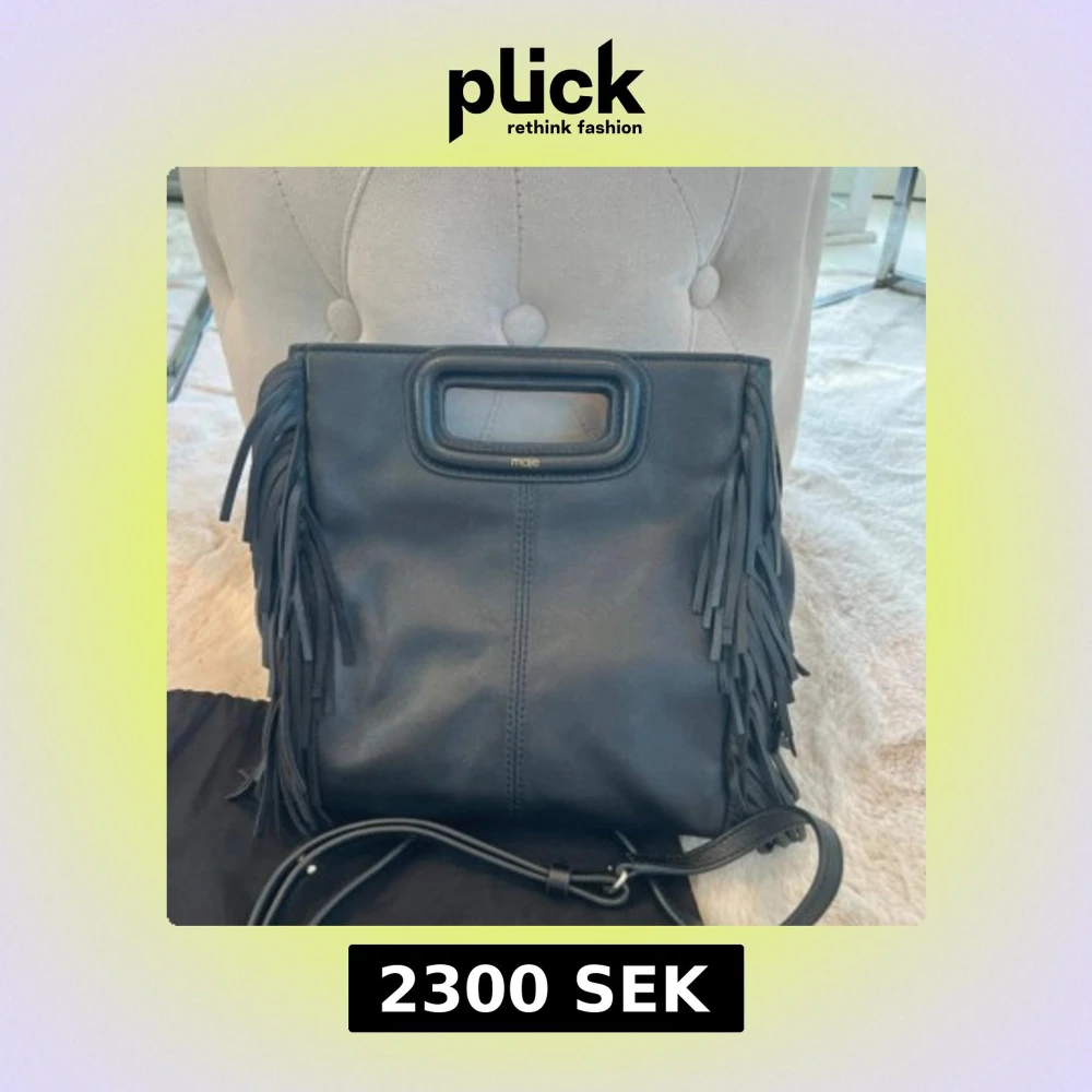 Cool svart handväska från Maje i skinn med fransar längs sidorna och ett snyggt handtag upptill. Väskan har en avtagbar axelrem och en stilren, fyrkantig form. Perfekt för dig som gillar detaljer och vill ha en unik accessoar.