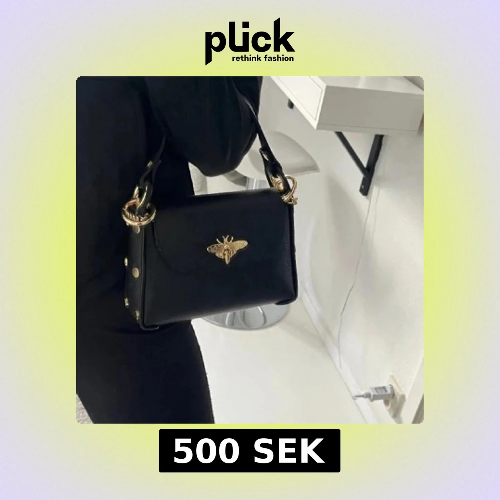 Snygg svart handväska i skinn med guldfärgad kedja och coolt bi i metall framtill. Väskan har både handtag och axelrem i kedja, samt dekorativa nitar på sidorna. Perfekt storlek för det viktigaste och ger en lyxig vibe till din outfit.En snygg liten väska. Storlek 20x13. Aldrig använt så super fint skick! Köptes för 700kr!