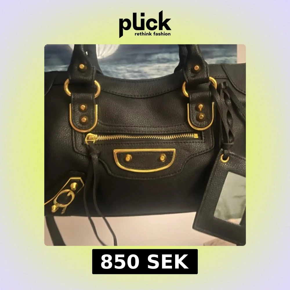 Säljer en svart handväska i skinn med snygga guldfärgade metalldetaljer och dragkedja framtill. Väskan har både handtag och axelrem samt en dekorativ spegel. Perfekt för dig som vill ha en stilren och rymlig accessoar. Köpt på en marknad!