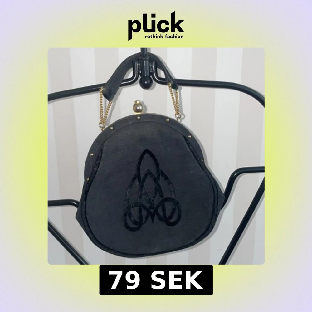Elegant svart handväska med en unik form och dekorativt mönster på framsidan. Mått 20*20 cm utan handtag.Väskan har en guldkedja och en praktisk bygelöppning med guldfärgad ram. Perfekt för att ge en stilfull touch till din outfit.