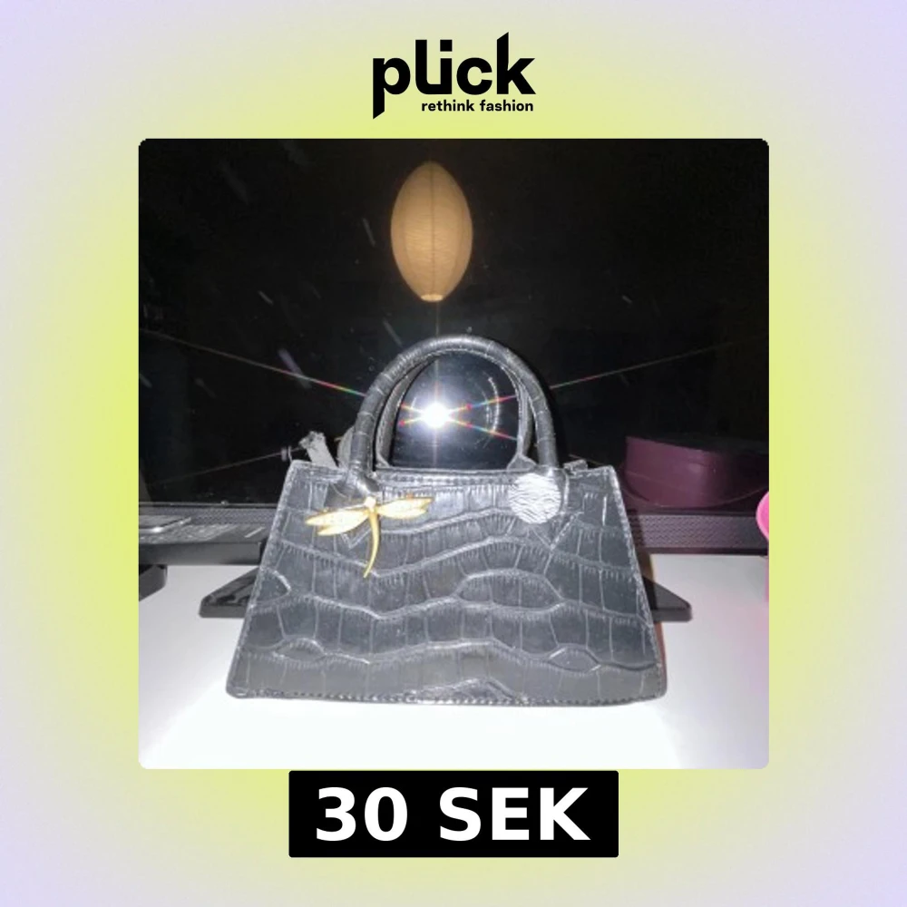 Snygg svart handväska med krokodilmönster och en dekorativ guldfärgad trollslända. Väskan har två handtag och en knappdetalj med zebramönster. Perfekt för att ge en elegant touch till din outfit.