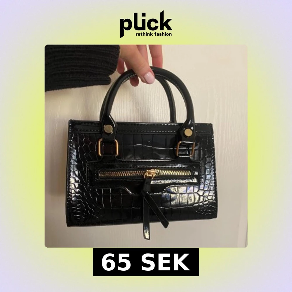 Snygg svart liten handväska med krokodilmönster och guldfärgade detaljer. Väskan har en dragkedja framtill och två handtag. Aldrig använd🥰