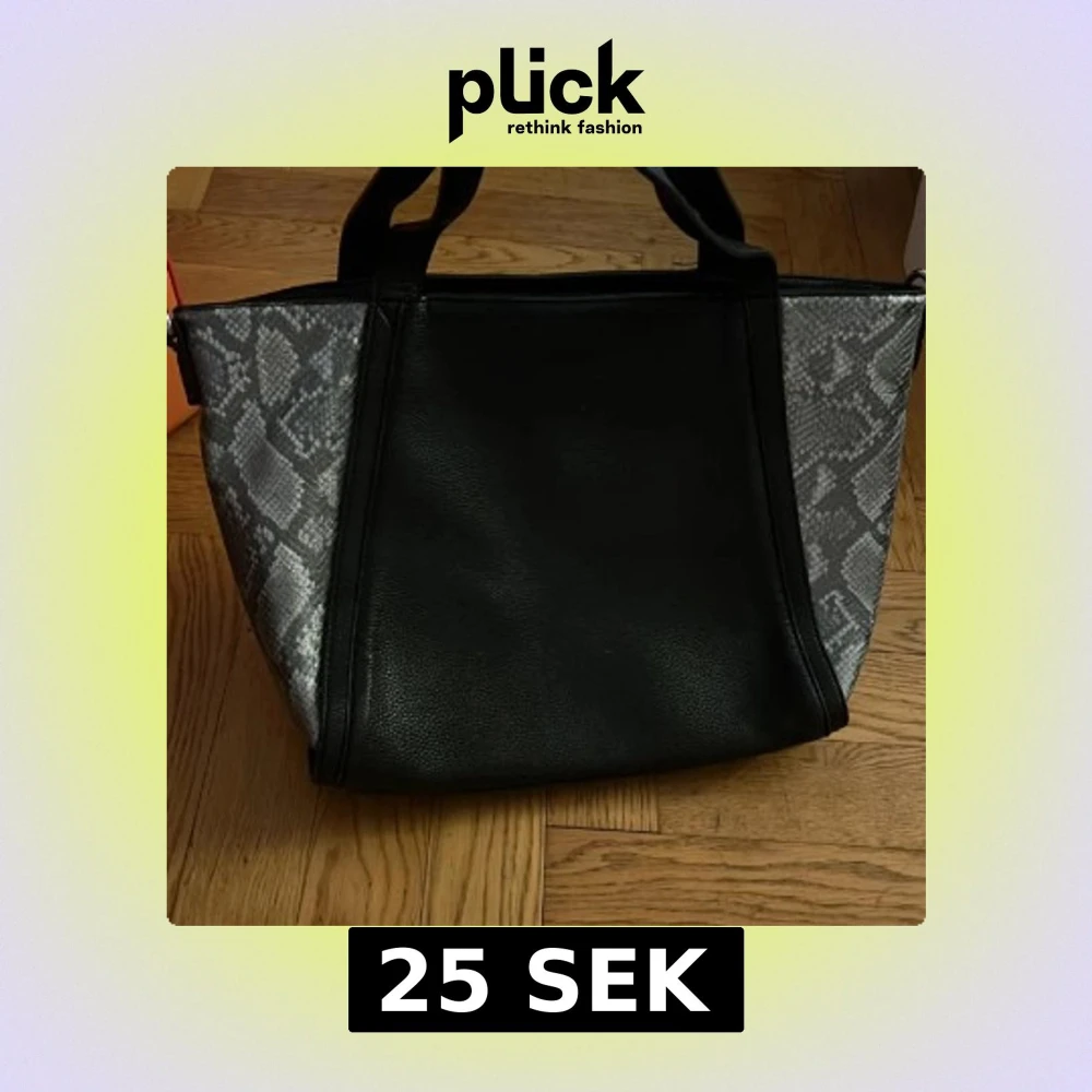 Snygg svart handväska med detaljer i grått ormmönster på sidorna. Väskan har två rejäla handtag, dragkedja upptill och ett extra fack med dragkedja på baksidan. Insidan är ljus och har flera fack för smart förvaring. Perfekt för dig som vill sticka ut lite extra.
