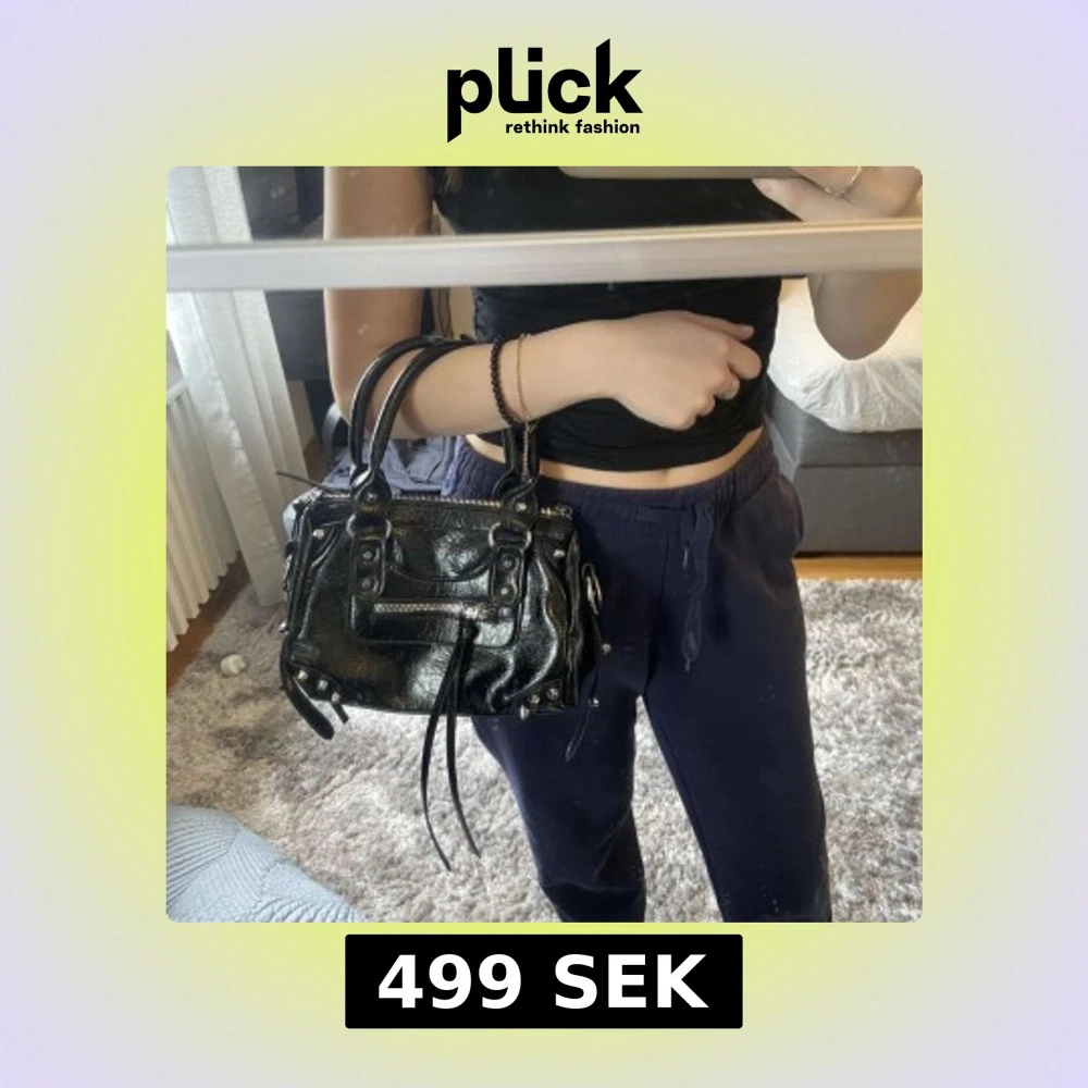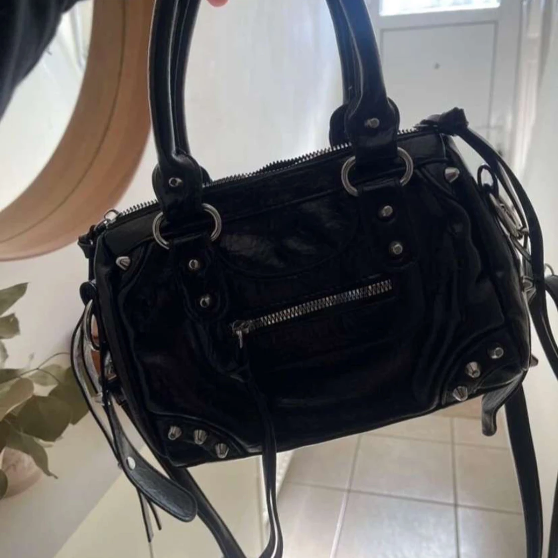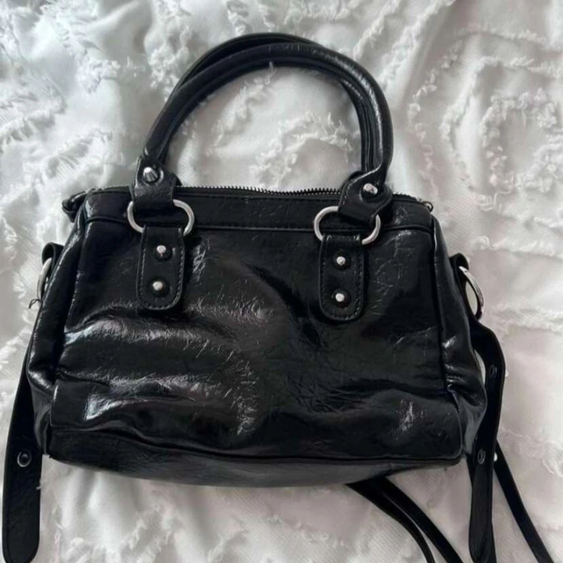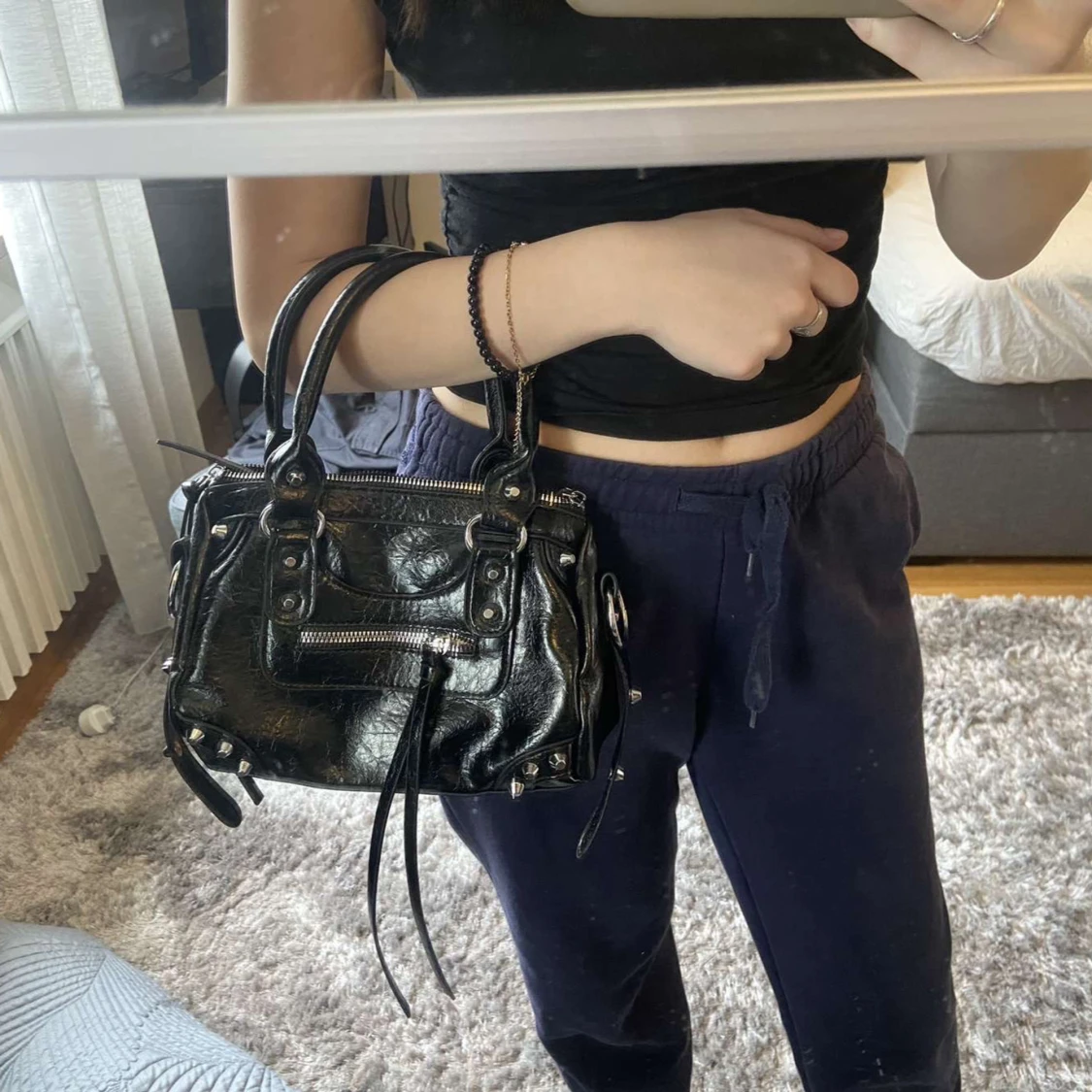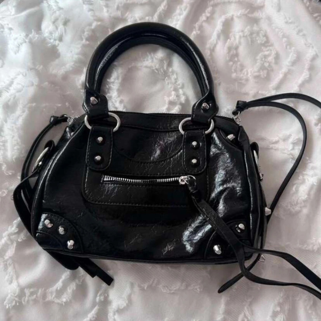 Säljer en svart handväska i glansigt material med silverfärgade nitar och dragkedja framtill. Väskan har både handtag och axelrem, samt dekorativa remmar och detaljer. Perfekt för dig som vill ha en cool och stilren accessoar.