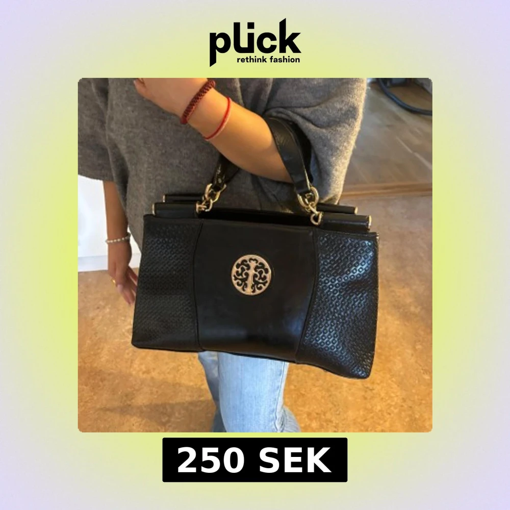Snygg svart handväska i skinn från Hasel med ett elegant guldfärgat emblem på framsidan. Väskan har två handtag och en praktisk dragkedja för säker förvaring. Perfekt för att ge en stilren touch till din outfit.