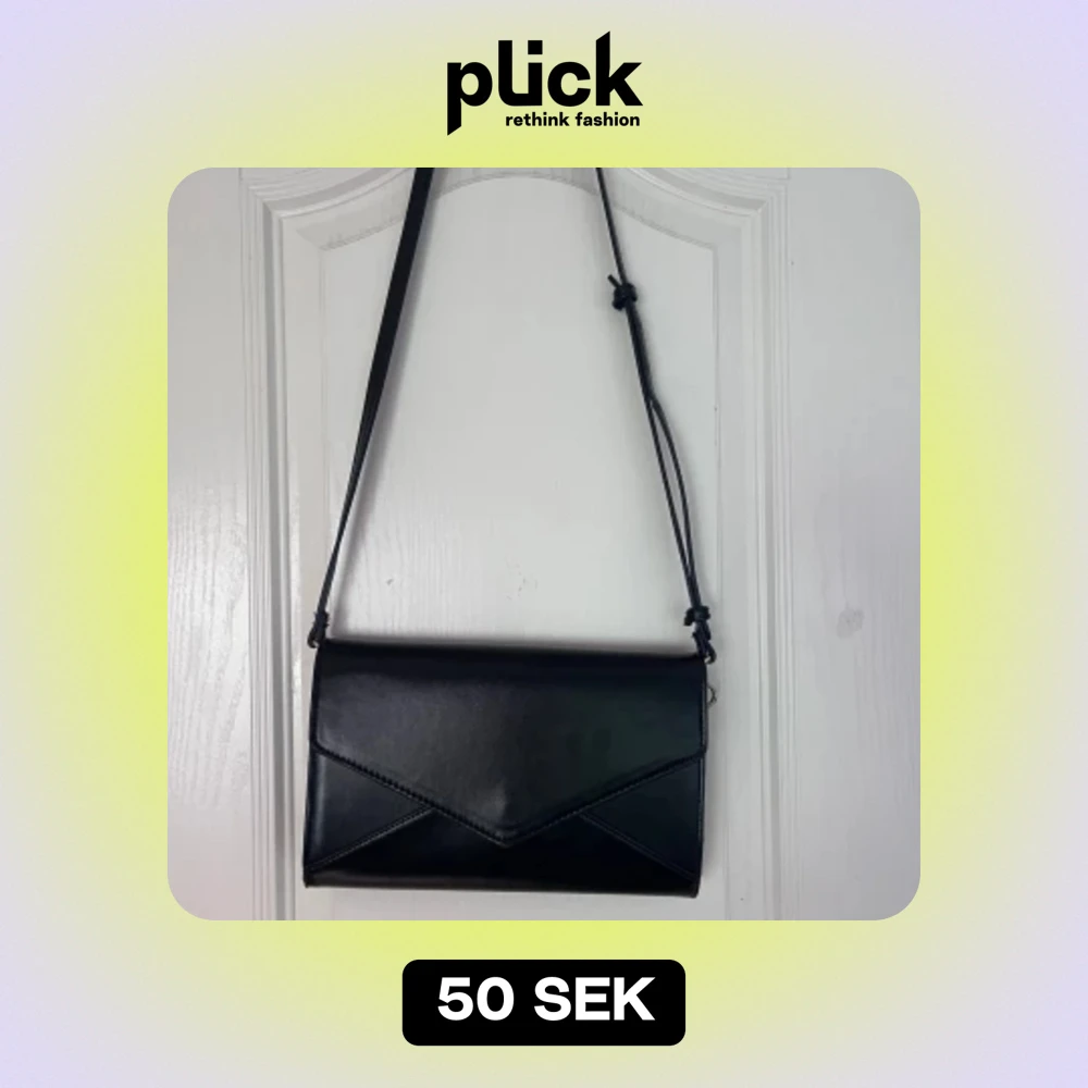 Ganska liten svart handväska. Långt justerbart band. Tofsen på sidan går att ta av😊