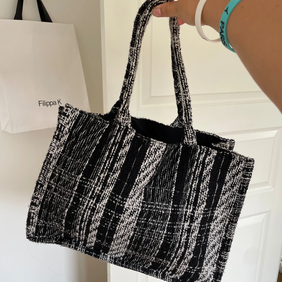 Säljer en snygg svartvit rutig väska från H&M. Perfekt för att bära med sig allt man behöver under dagen. Väskan har ett stilrent mönster och är rymlig med bekväma handtag. Den är i bra skick och redo för nya äventyr!
