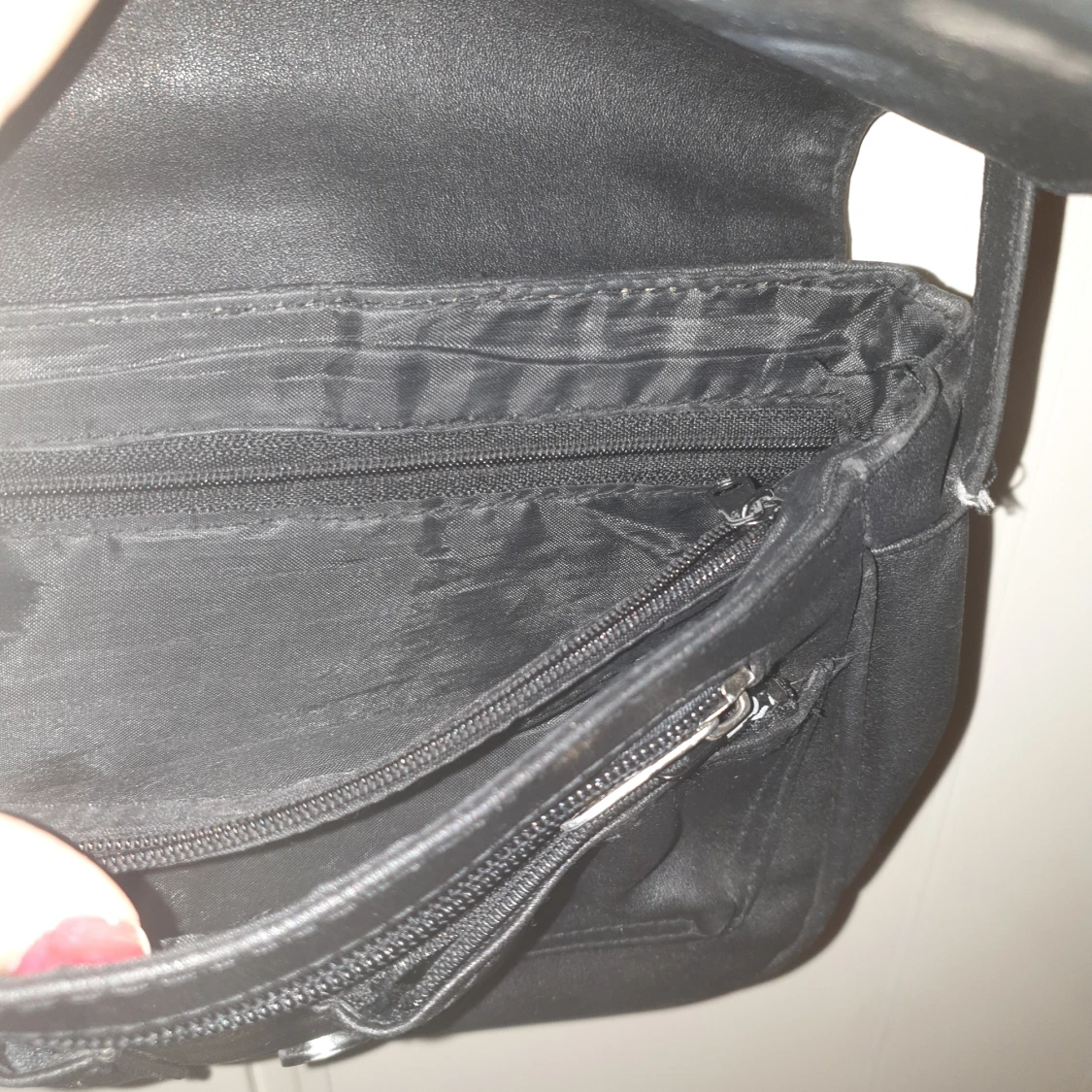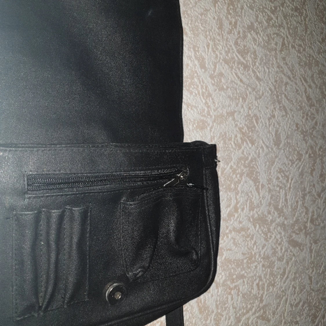 Svart handväska med många fickor. Mycket plats för förvaring. Använd flera gånger, lite sliten men fortfarande i bra skick. Justerbar. Mått: 22×17cm