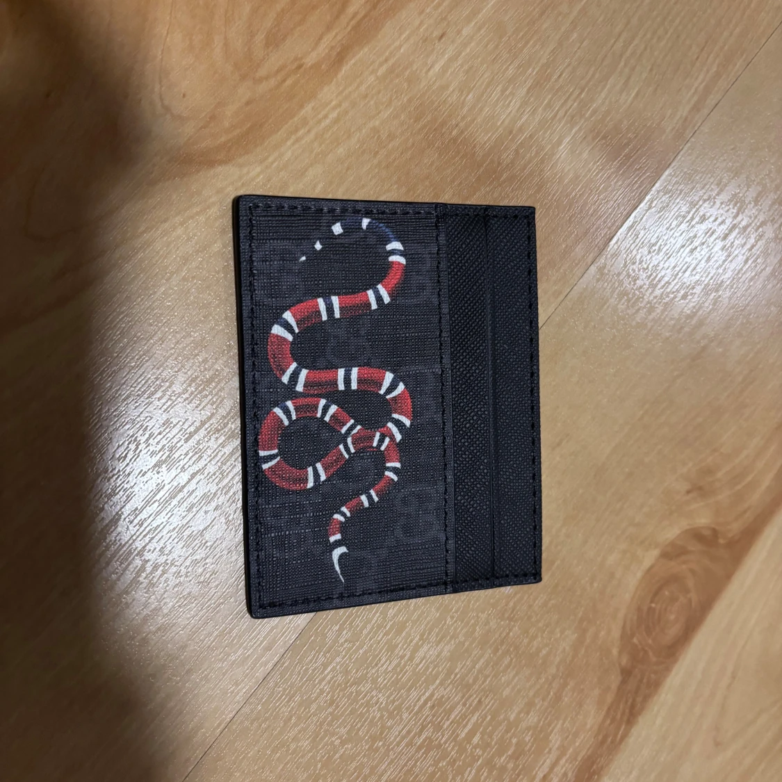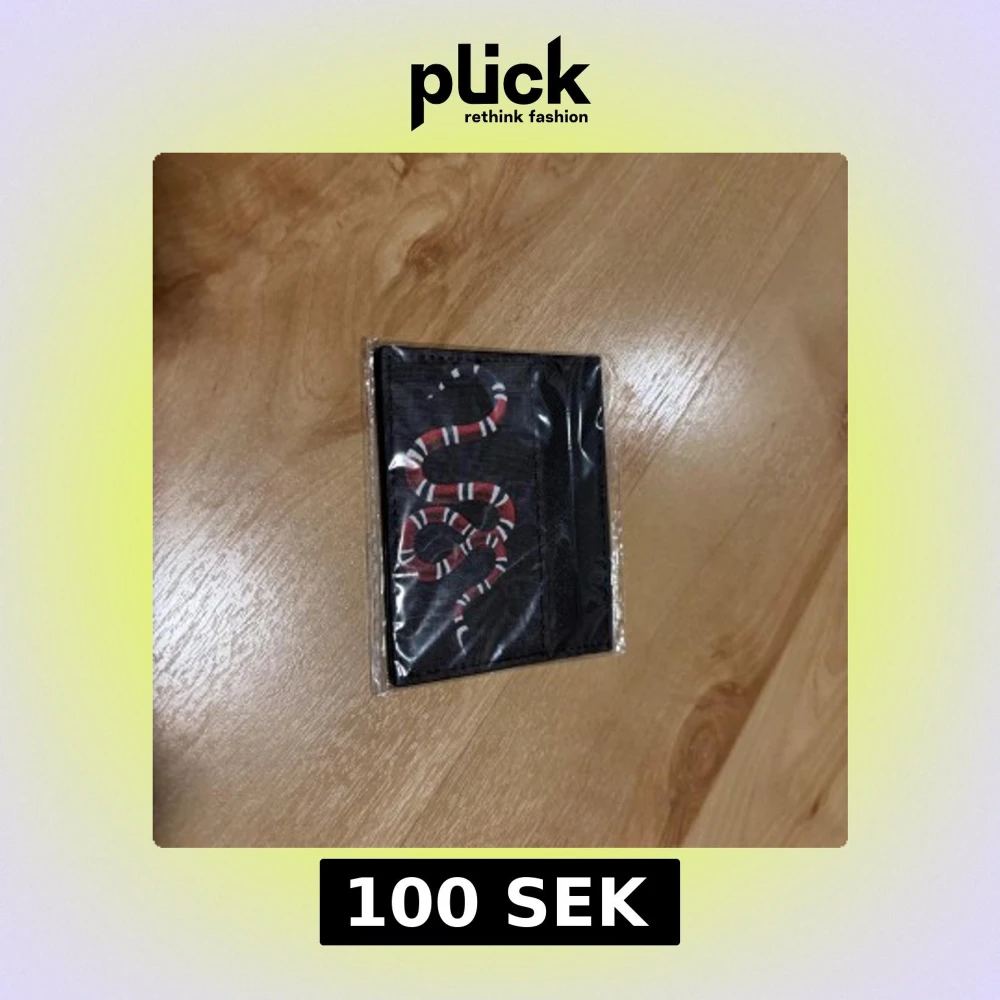 Snyggt svart kortfodral med ikoniskt GG-mönster och en röd, vit och svart orm på framsidan. Perfekt för kort och ID, smidig att ha i fickan. Tillverkat i tåligt syntetmaterial med stilren design.