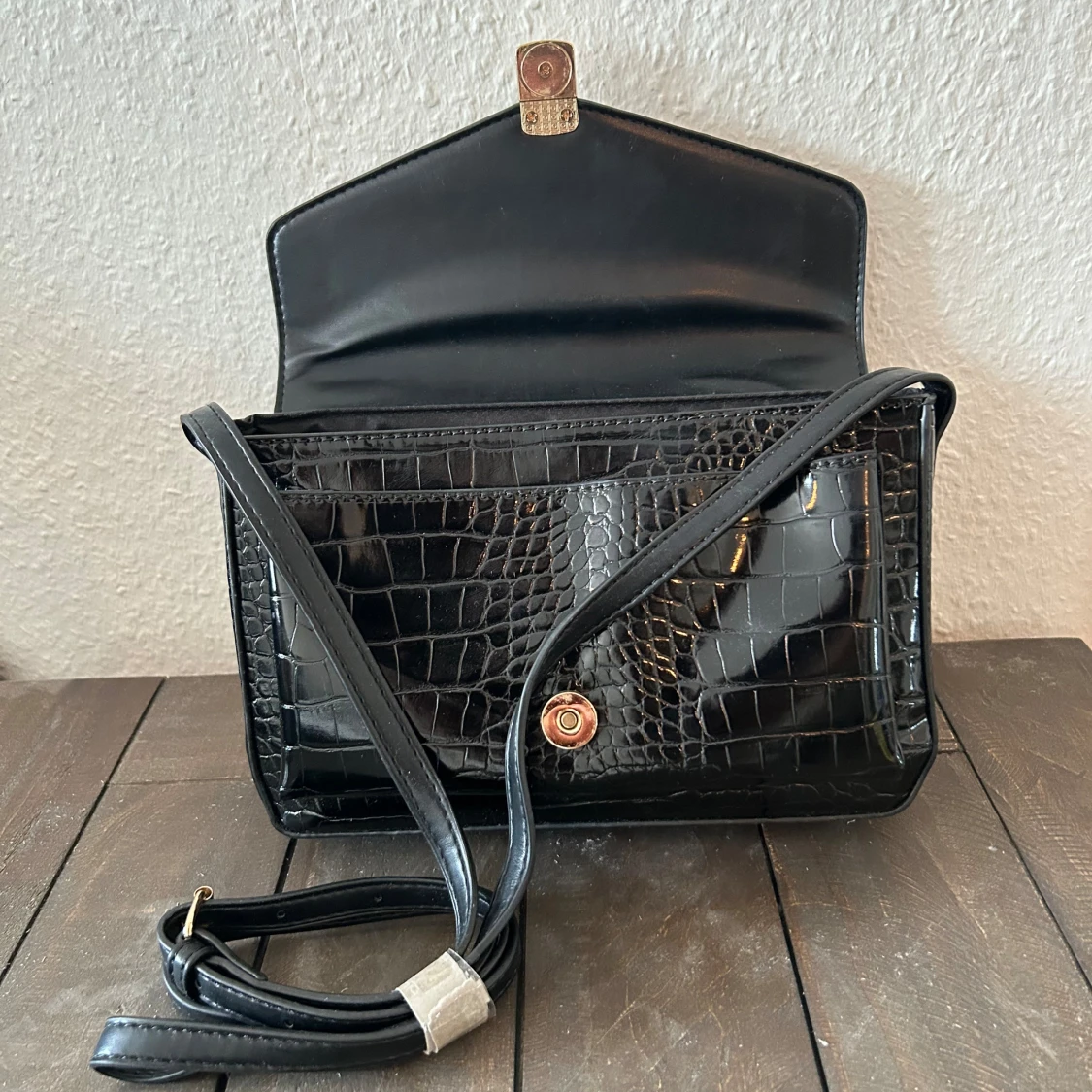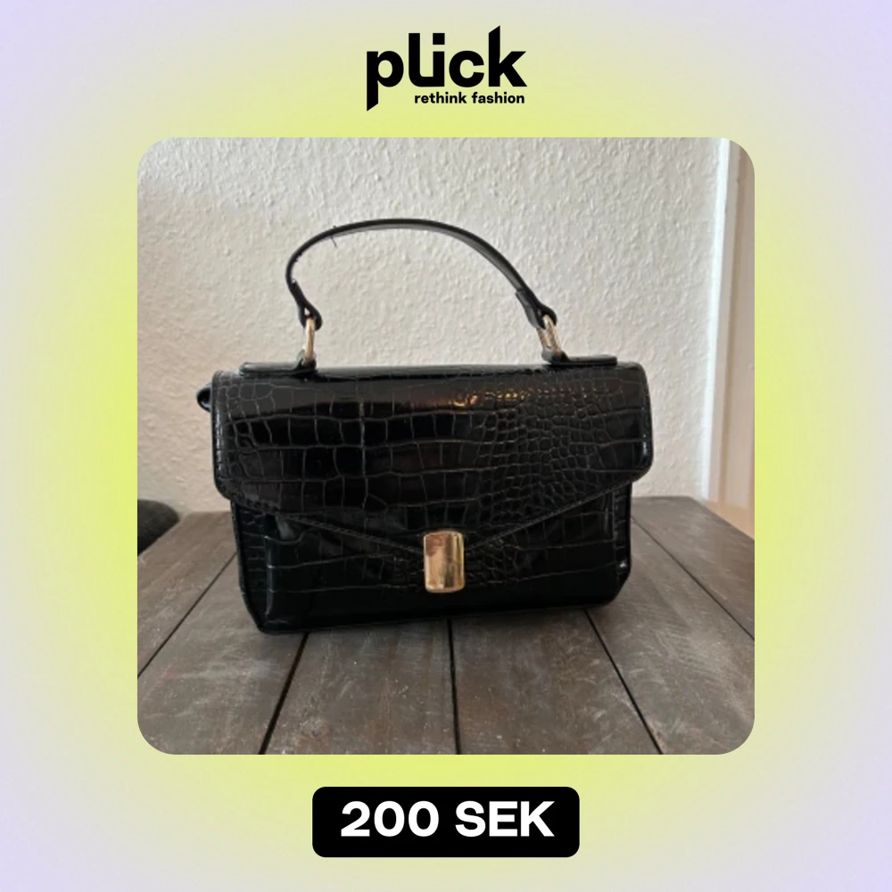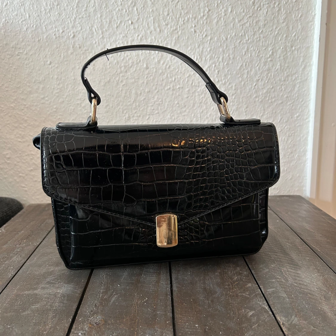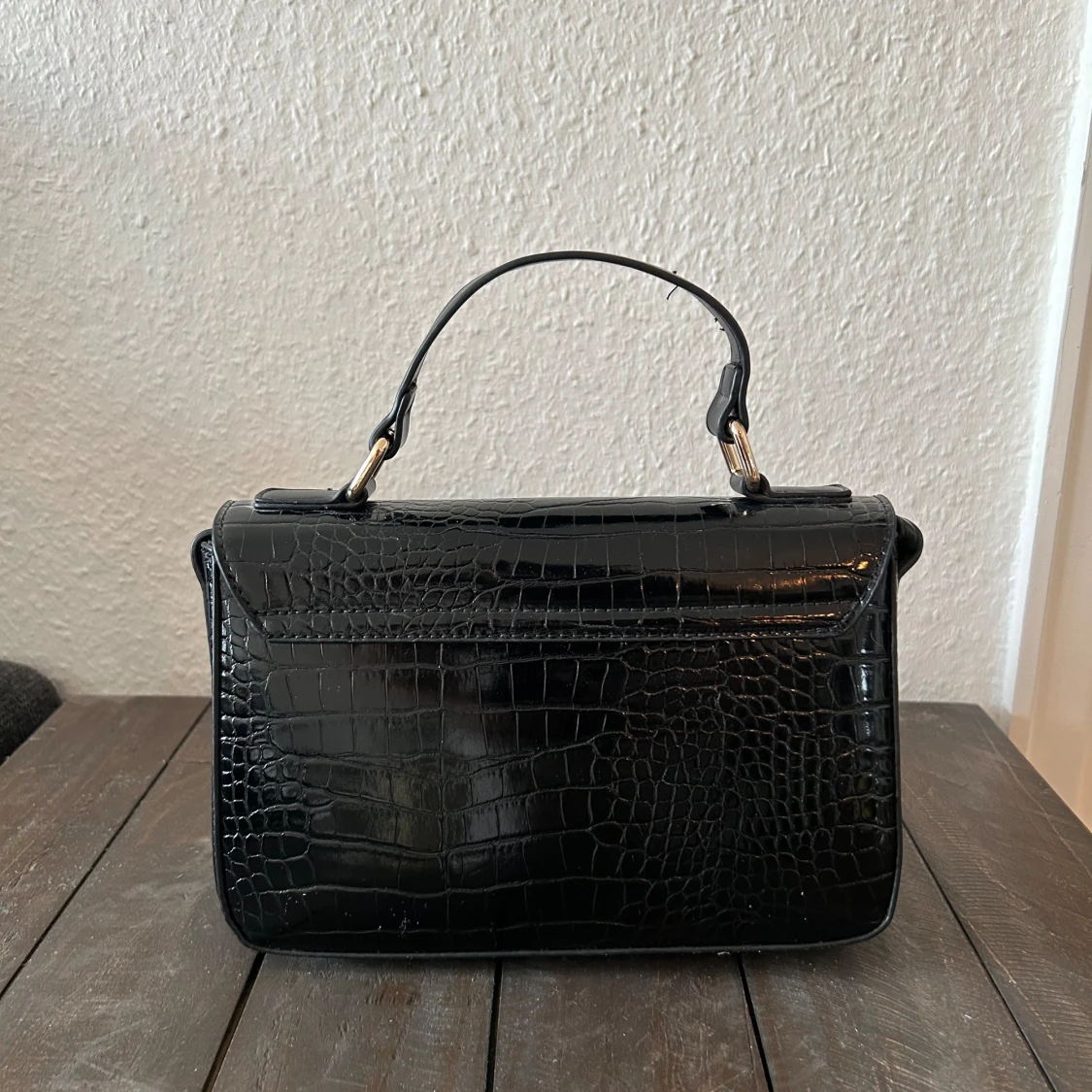 Säljer en superfin svart handväska med krokodilpräglat mönster. Den har ett handtag och en justerbar axelrem för extra bekvämlighet. Väskan stängs med ett snyggt metallspänne och har gott om plats inuti för alla dina nödvändigheter. Perfekt för både vardag och fest!
